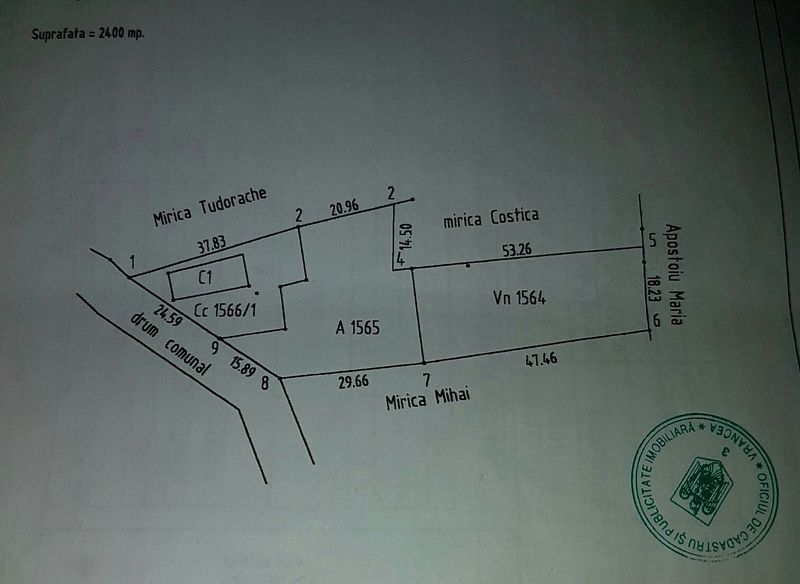 6 euro/ mp. Teren intravilan plus casa batraneasca, deschidere 40 mp la drum comunal asfaltat, zona viticola, la 30 minute de Focsani,