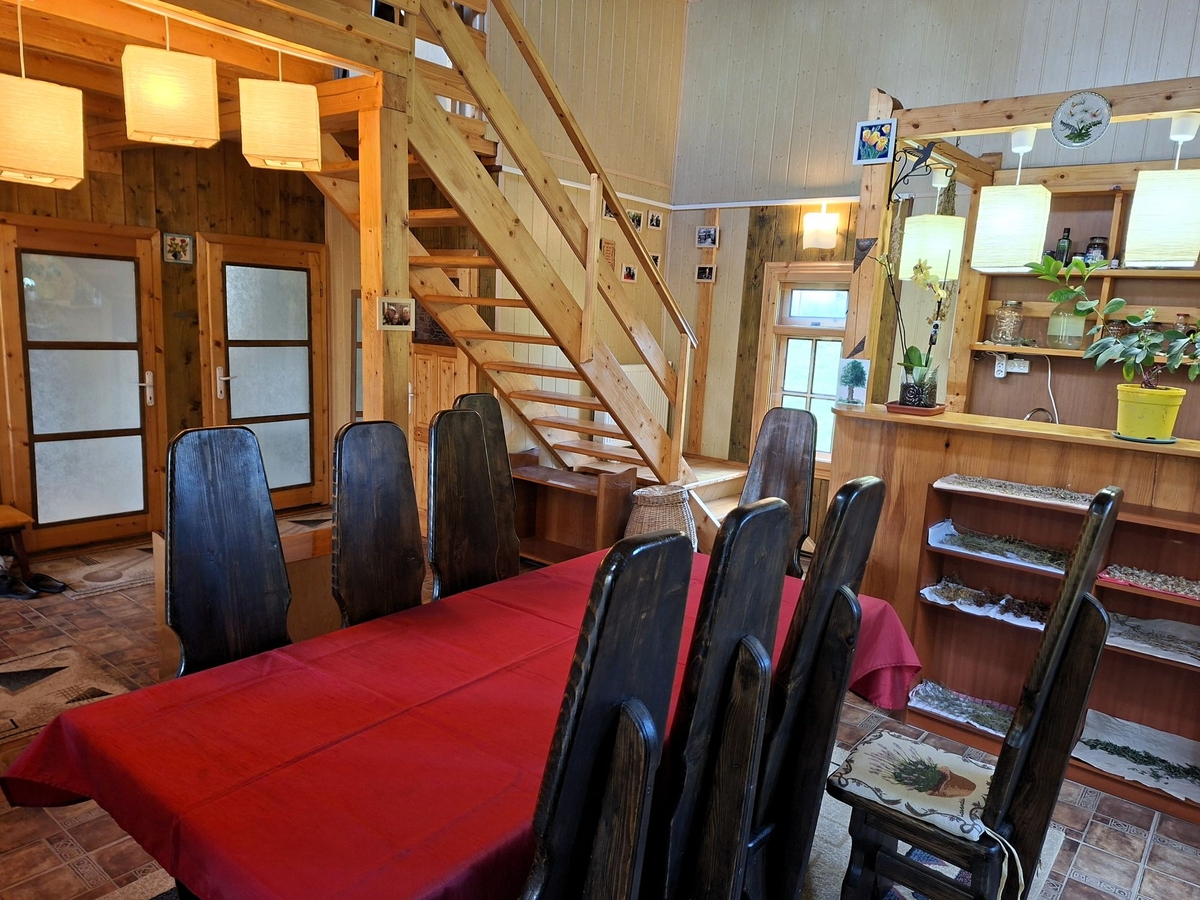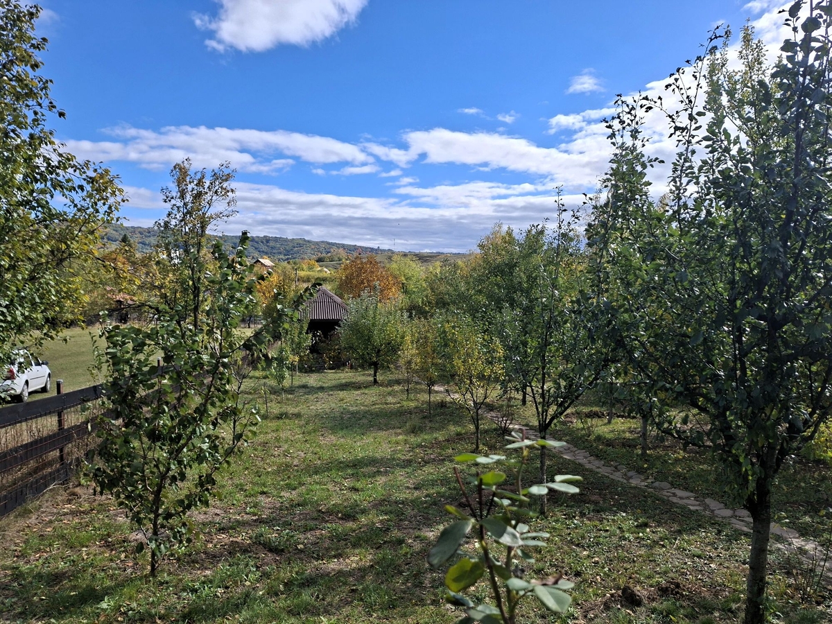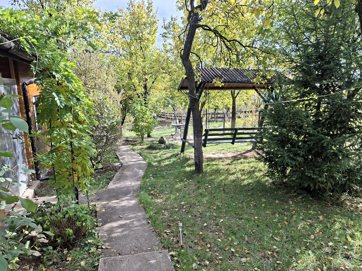 Pe suprafata generoasa a terenului, de 7017 mp se gasesc pomi fructiferi (visini, peri, pruni, meri si caisi) gradina, vita de vie, gradina de flori, arbori (stejari, mesteceni, brazi si molizi), recipiente de compost iar in zona impadurita e o vatra de foc.