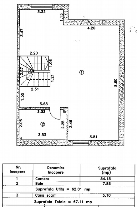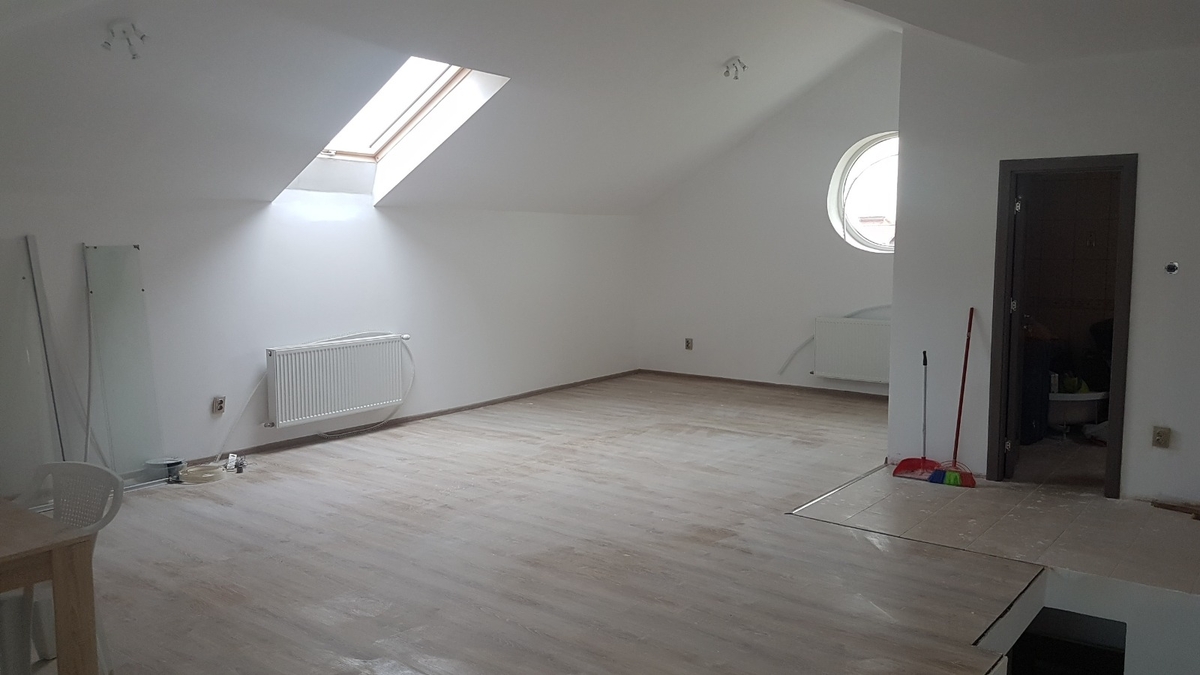 Mansarda open space cu baie, scara si placa beton; permite o utilizare variata si compartimentare.