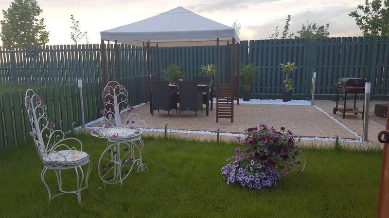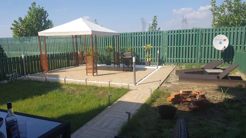 Teren = 130mp, Terasa construita 40mp gresie triplu-stratificata import Italia, gazon, nisip, pietre albe decorative, iluminata,pasi japonezi