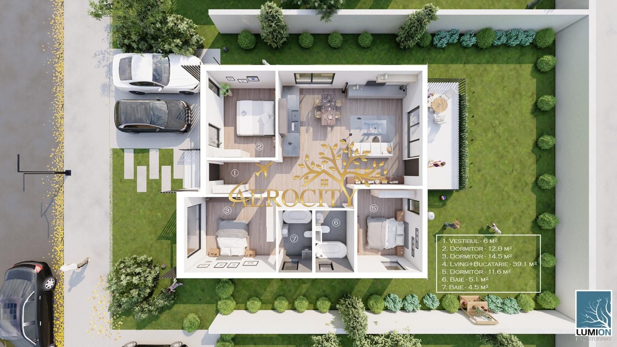 Ansamblul rezidential Aerocity totalizeaza peste 200 de case individuale in aceasta prima faza, variate prin: arhitectura, suprafata, compartimentare. In cadrul ansamblului exista 7 proiecte de vile: 4 proiecte parter si 3 proiecte cu etaj. Suprafata construita a ansamblului Aerocity este de 110 000 mp, iar 40 000 mp reprezinta locurile de parcare, arterele circulabile, zonele verzi generoase din jurul caselor. Aerocity este un complex rezidential independent ce beneficiaza de racorduri la toate utilitatile publice (apa, canalizare, gaz, electricitate) dar si de spatii pentru recreere (loc de joaca si tarc pentru caini).