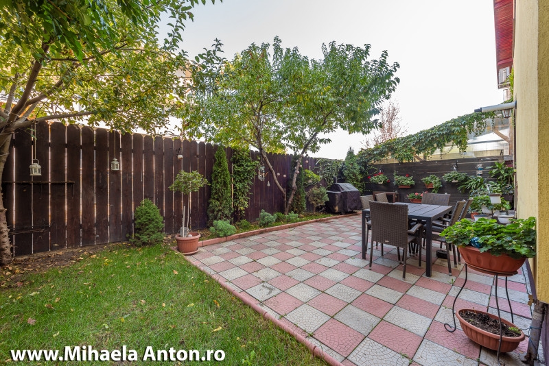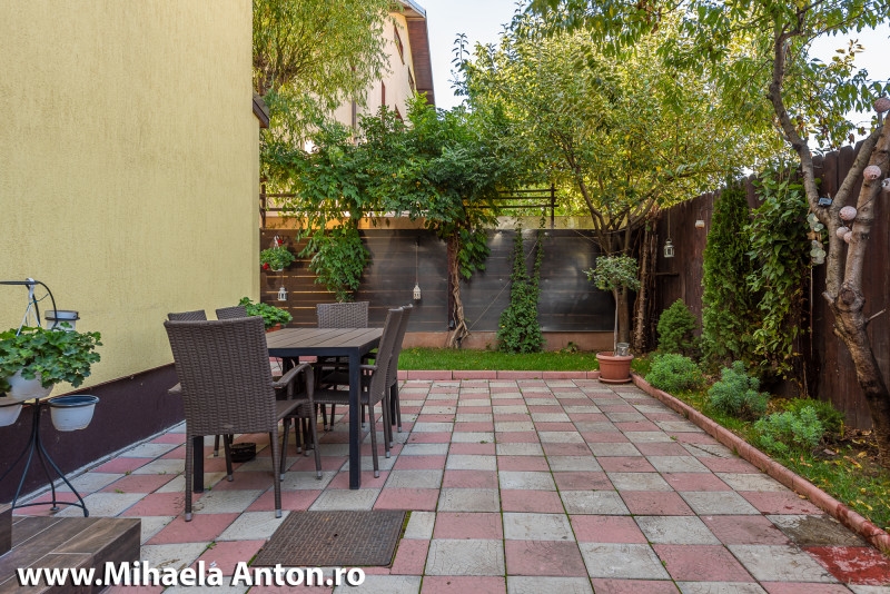 Curtea este ingradita cu gard din lemn si este amenjata cu pomi fructiferi, flori, gazon. In curtea din spate, pavata cu dale, s-a amenajat o zona de luat masa.