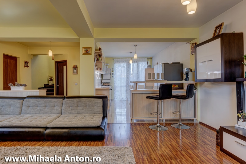 Livingul este amenajat cu canapea generoasa si mobilier modular de zi. Bucataria este separata de living printr-un mobilier tip Insula dotata si cu spatii de depozitare si 2 scaune de bar.