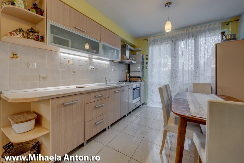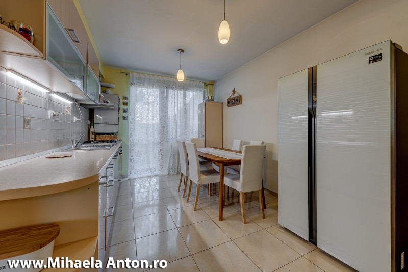Bucataria este complet mobilata si utilata cu toate electrocasnicele necesare ( plita, cuptor, hota, incroporate in mobilier, toate marca Bosch, masina de spalat vase Beko)