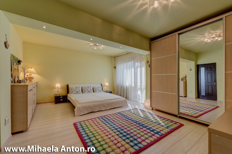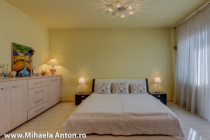 Dormitorul matrimonial este complet mobilat cu pat dublu, dressing cu usi glisante, comoda si noptiere.