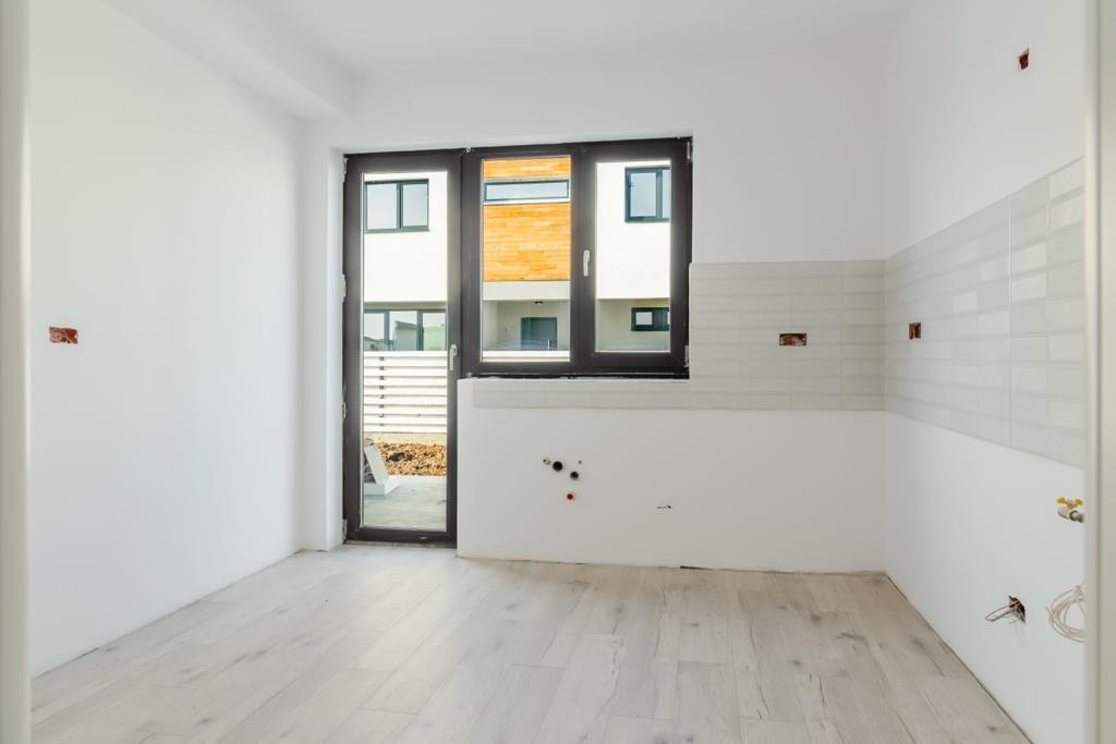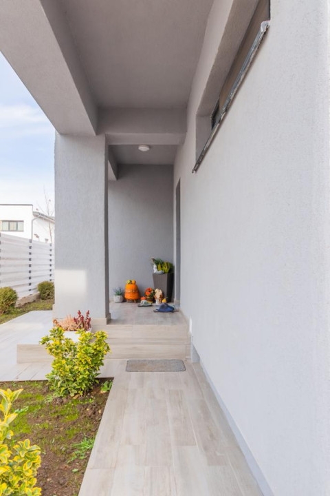 -Parterul are un hol de acces catre bucatarie,camera tehnica, baie si living. Din living se poate iesi pe terasa exterioara, aceasta avand o suprafata de 30mp.
