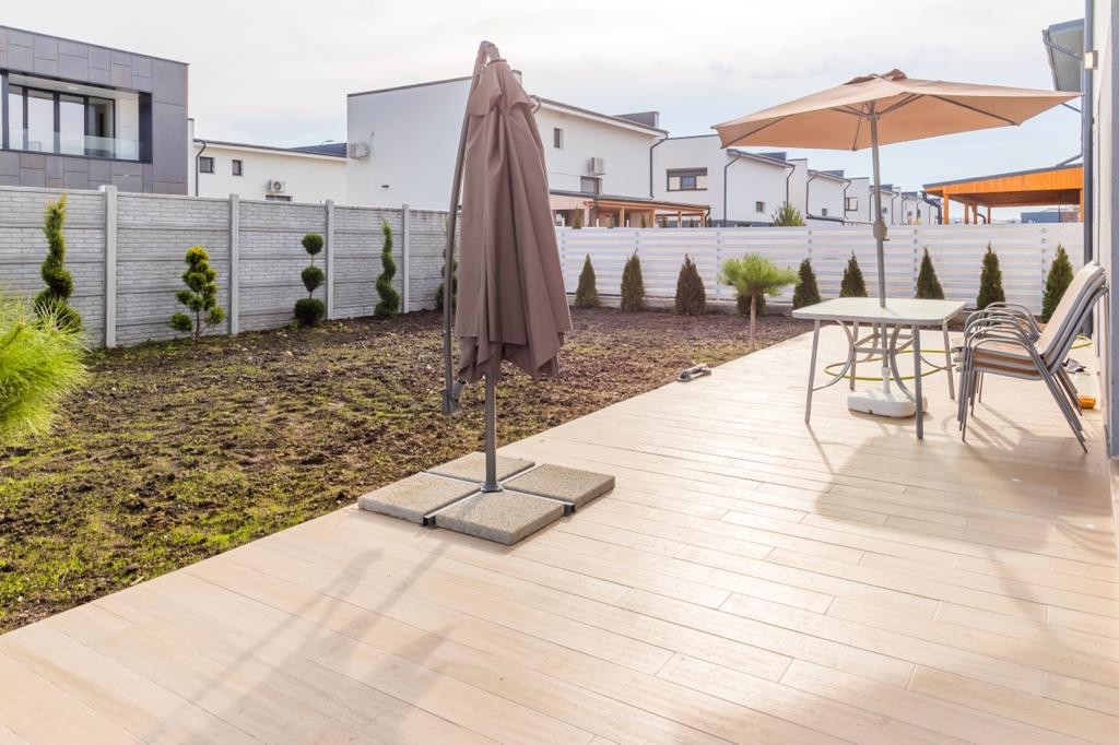 Fiecare vila beneficiaza de 3 locuri de parcare cu intrare individuala si gradina proprie, pe care ti-o poti amenaja dupa bunul plac, pentru a-ti petrecere timpul liber. Desfasurarea vilei este astfel :