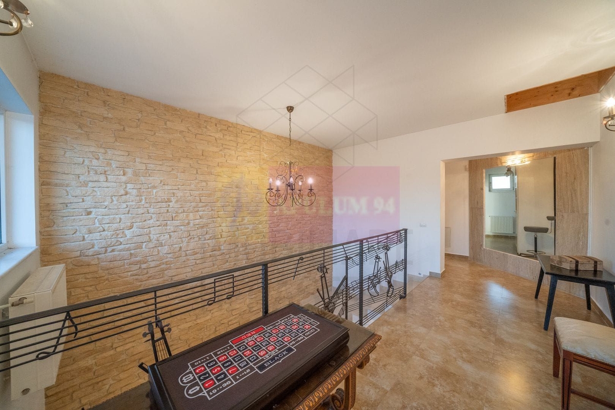 Finisajele interioare sunt de foarte buna calitate, respectiv termopane PVC Veka, parchet triplu stratificat, marmura in toate baile, incalzire pardoseala electrica bai parter si etaj, Gresie spania, granit, piatra naturala in living si peretele scarii si holului de la etaj, usi interioare din lemn Franta pe culoarea alba, 4 aparate de aer conditionat, centrala Bosch in condensare 32 kw, sistem securitate BGS, distribuitoare apa menajera?caldura parter si etaj.