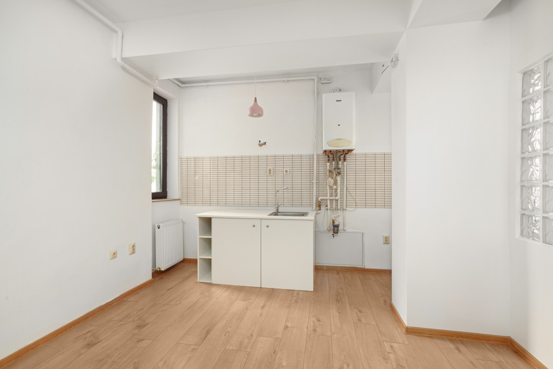 Garsoniera are 42 mp. Utili. E mare, frumoasa. Are o bucatarie super spatioasa, separata, cu loc de luat masa, doua ferestre. Baia, mare si prevazuta si ea cu fereastra. Camera, suficienta pentru un mix intre zona de dormit si zona de zi. Amplasata la etajul unu, blocul fiind prevazut pe subsol si patru etaje. La subsol, locuinta dispune si de o boxa destinata depozitarii.