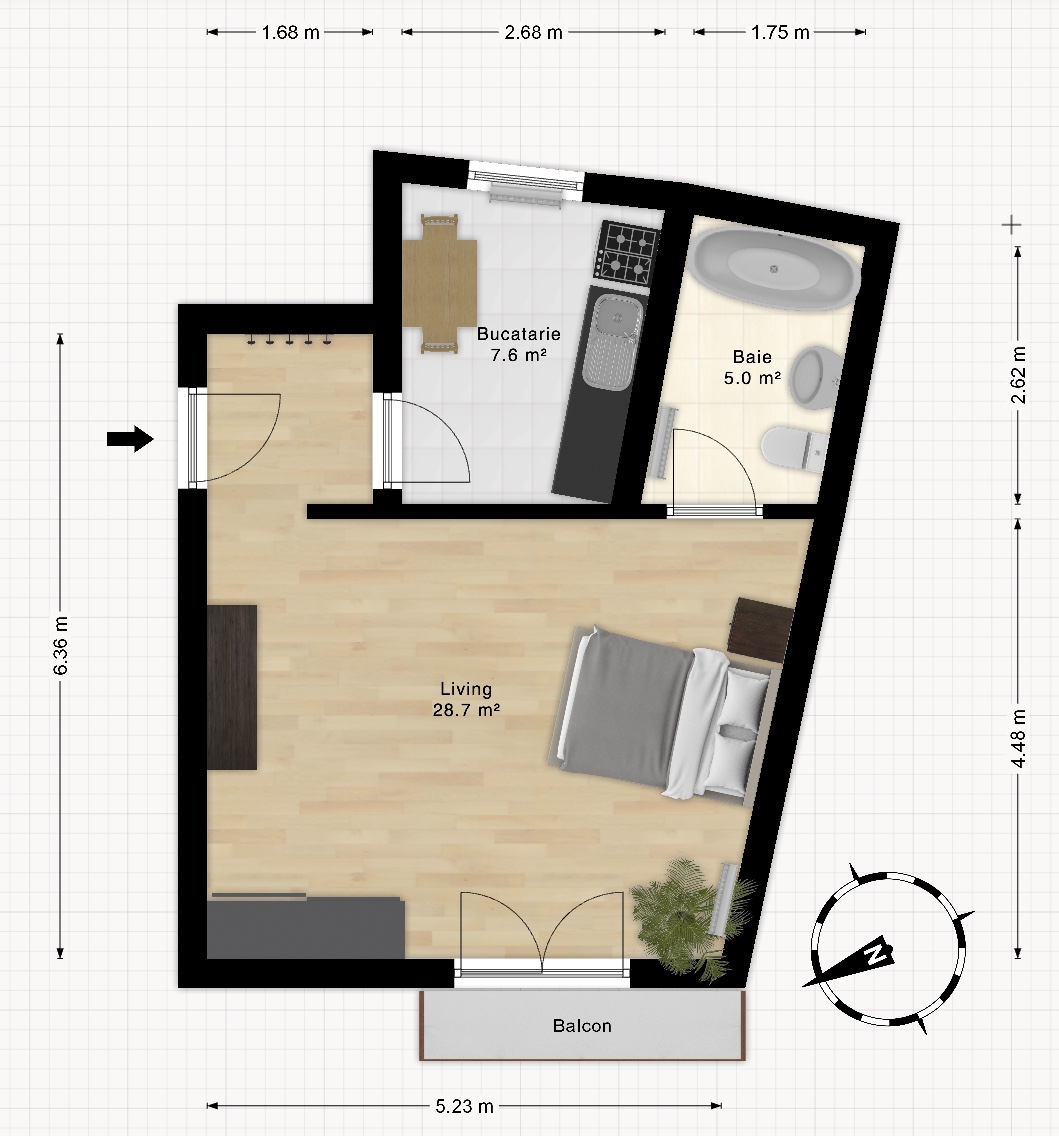 Garsoniera este formata din o camera, bucatarie, hol si balcon. Cu o suprafata utila de 39,09 mp. si o suprafata totala de 40,19 mp imobilul mai dispune si de o boxa avand suprafata utila de de 2,11 mp si asemenea include un loc de parcare in subteran (nivel -1) avand suprafata utila de de 11,50 mp. Garsoniera are finisaje contemporane (parchet, gresie, faianta), este dotata cu aer conditionat, iar toate utilitatile sunt contorizate separat. Blocul este o constructie moderna, cu incalzire centrala si lift propriu.