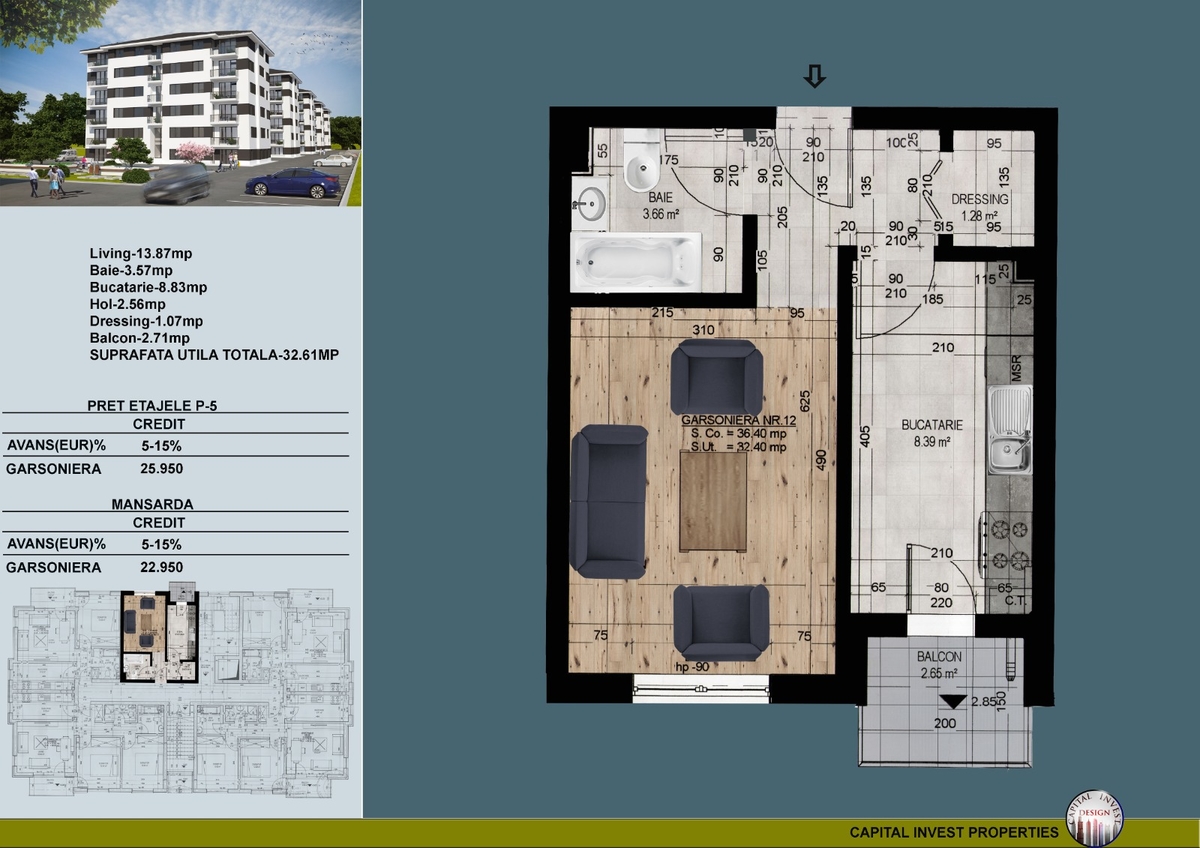 Garsoniera are o suprafata utila de 32.61 mp utili.