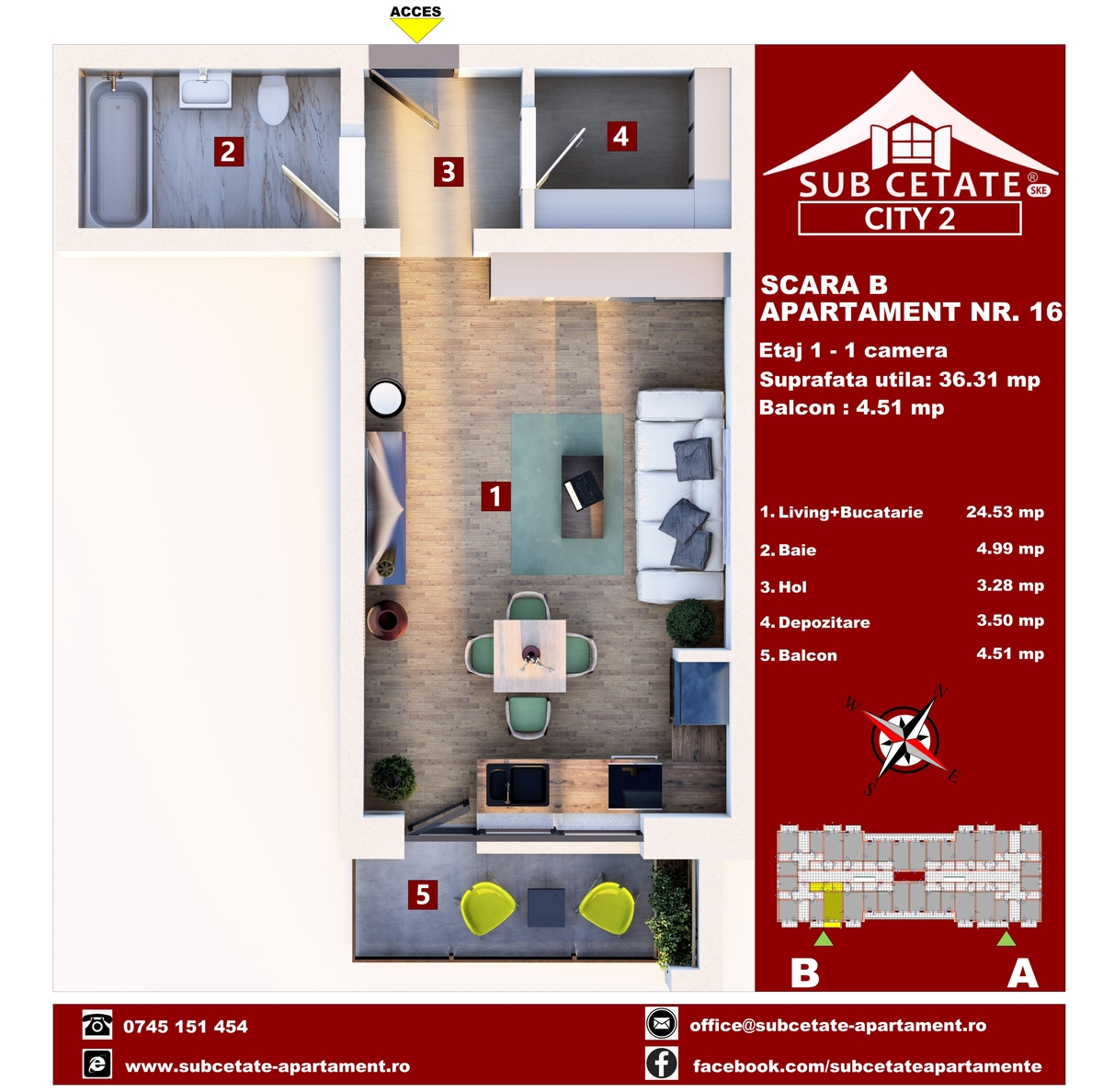 Complexul este construit pe malul unei ape curgatoare, iar panorama deosebita a muntilor care va incanta privirea noilor proprietari este unul din atu-urile noastre. Pe langa integrarea perfecta in zona, complexul rezidentual beneficiaza de toate facilitatile, utilitatile, inclusiv spatii comerciale in incinta,locuri de joaca pentru copii,spatii verzi si zona de relaxare.