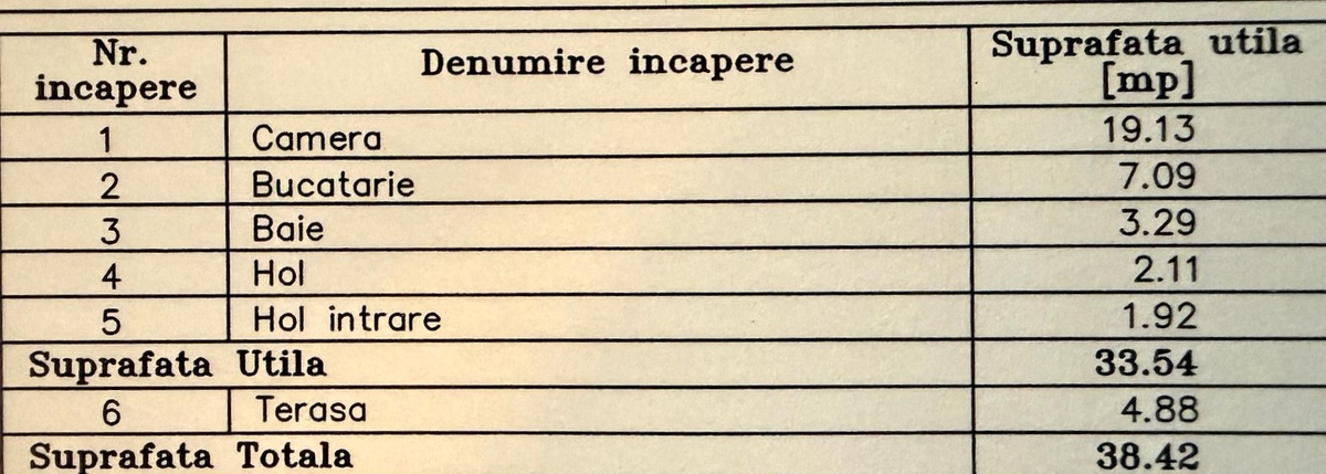 Suprafata este de 34,5 mp utili, respectiv 38,5 mp utili cu balcon.