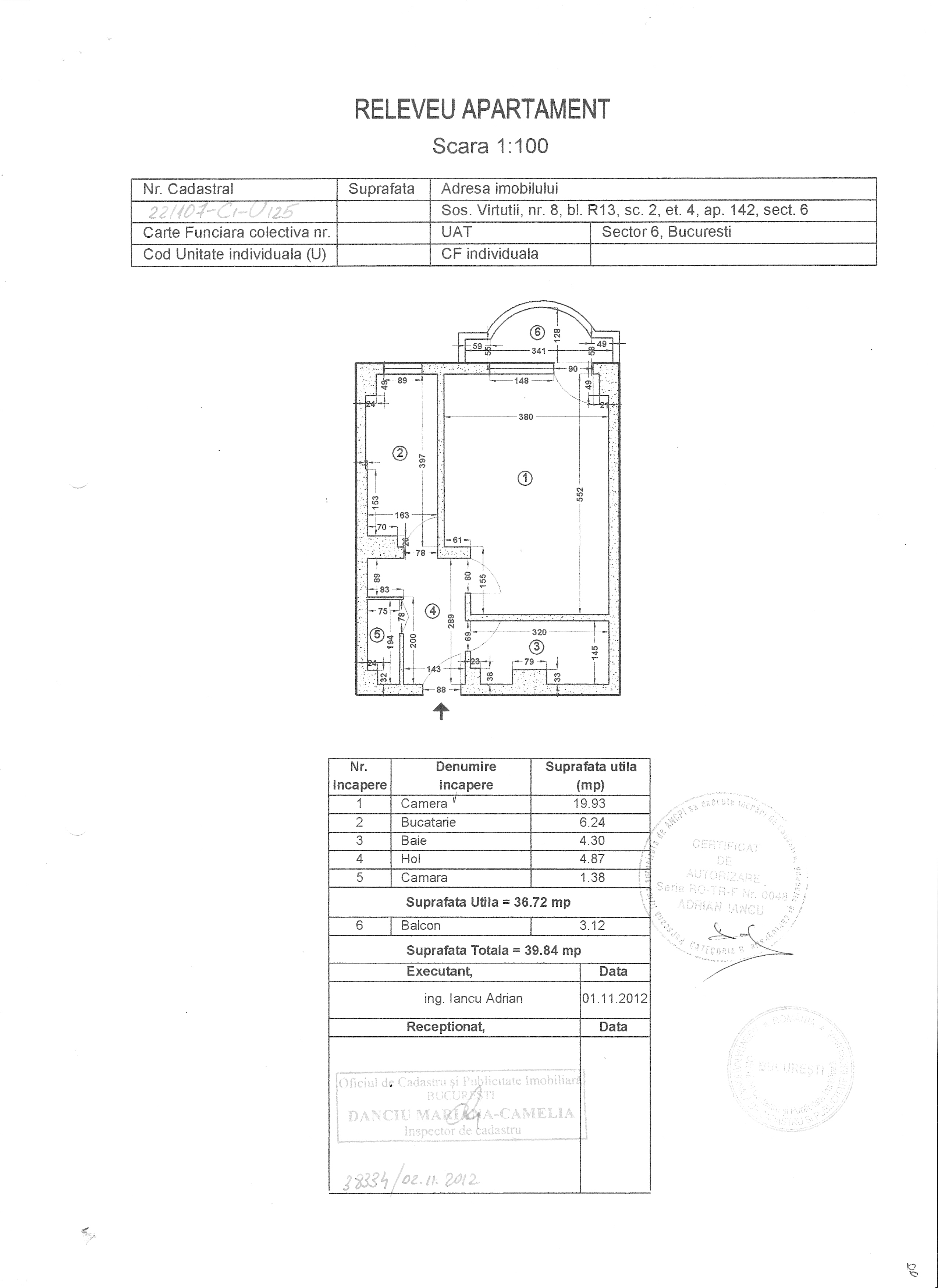 Suprafata utila este de 36,72 mp, balcon 3,12 mp, suprafata totala de 39,84mp, impartita conform releveului atasat.