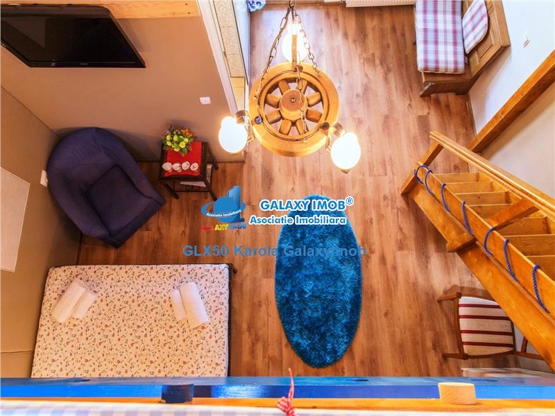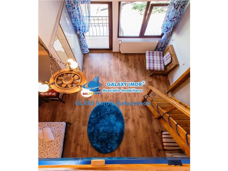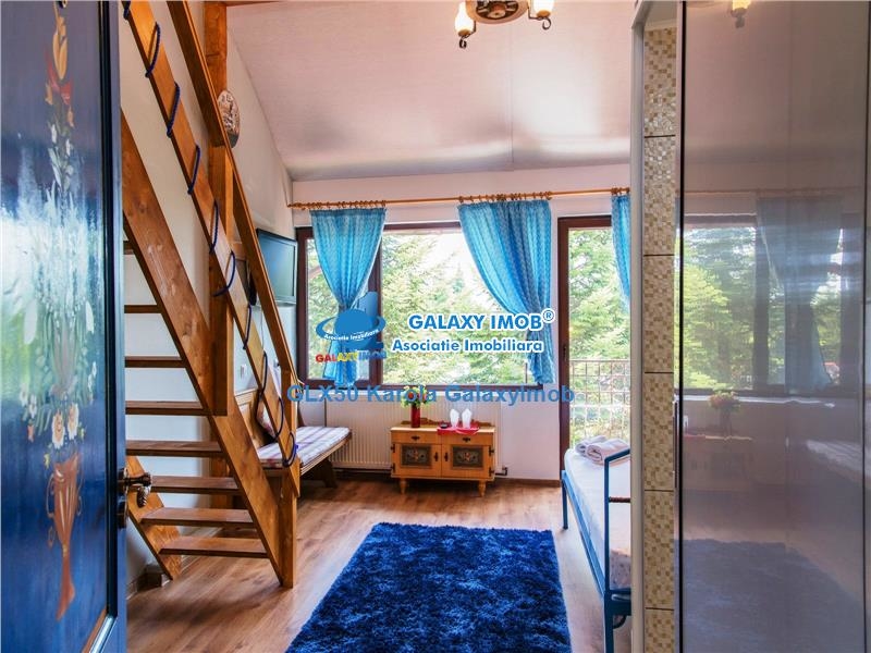 Etaj 1: hol central, 5 camere cu 5 bai proprii , 2 apartamente cu etaj si scara interioara din lemn, 1 balcon tip lojie.
