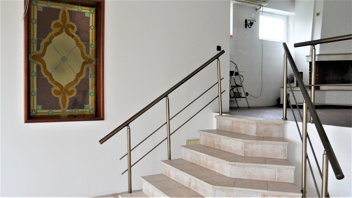 La etaj avem o superba sala de protocol, cu dispunere pe doua inaltimi, in care troneaza un semineu perfect functional, dotat cu toate accesoriile. Iesirea pe balcon da si mai multa functionalitate etajului, acum gandindu-ne la fumatori.