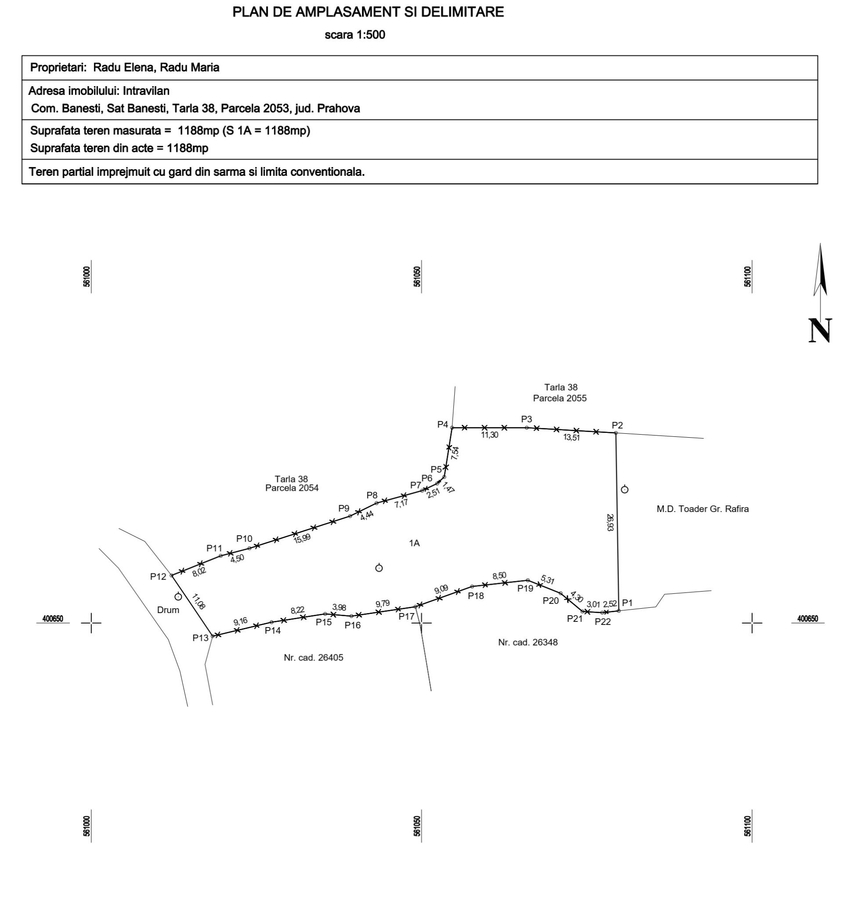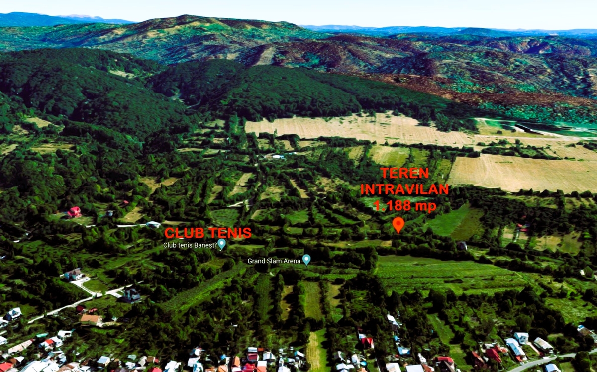 vand teren intravilan Banesti, in suprafata de 1.188 mp, orizontal, fara inclinatie, in forma de trapez, deschidere la drum 11 m, dimensiuni maxime spre spatele terenului 27 X 27 m.