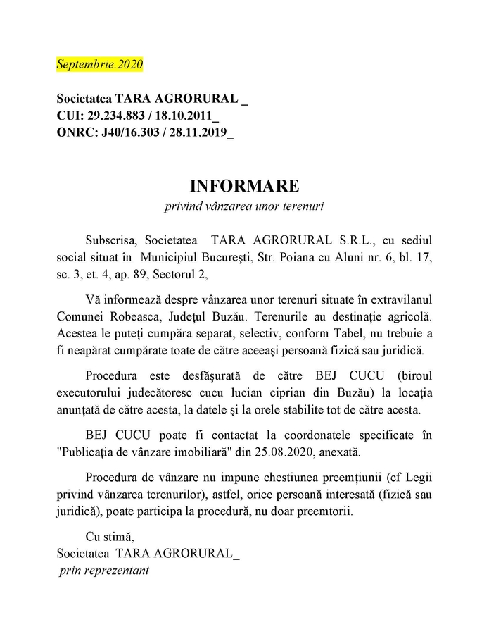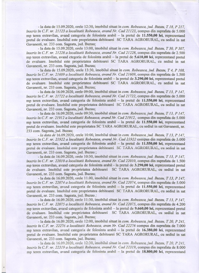 Teren arabil 8,65 ha, pret 23.090 ha, com. Robeasca, jud. Buzau, colt cu com. Jirlau, jud. Braila. Vanzarea la licitatie pe parcele in 15 sept. ora 9. Contacti Bej Cucu, Buzau.