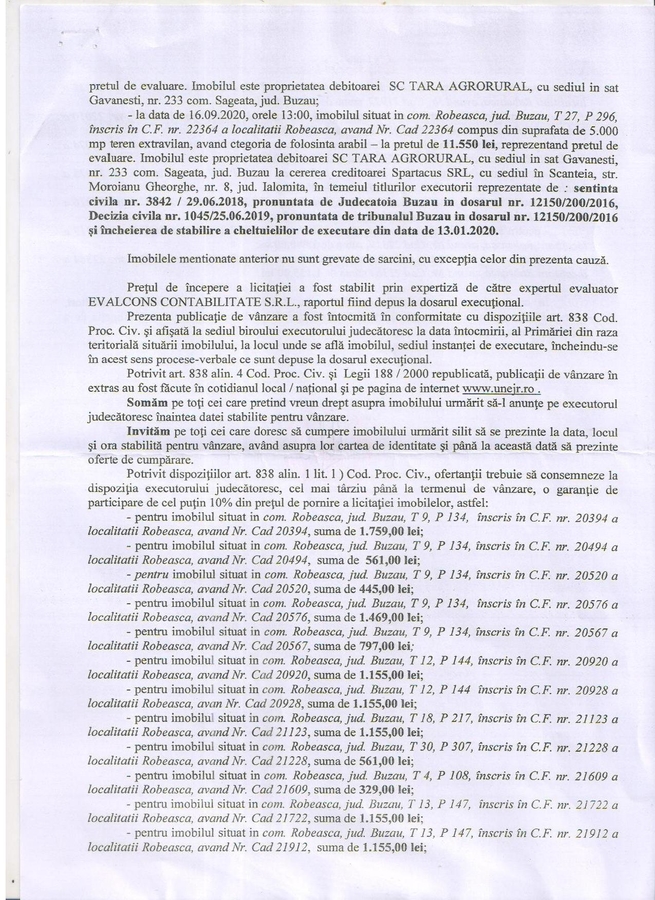 _Terenul se vinde la licitatie, pe 19 parcele, Teren Arabil in suprafata totala de 8,65 Ha la Pretul de 23.090 Lei per Hectar. Este situat in Comuna Robeasca, Judetul Buzau, limitrof cu Comuna Jirlau, Judetul Braila.