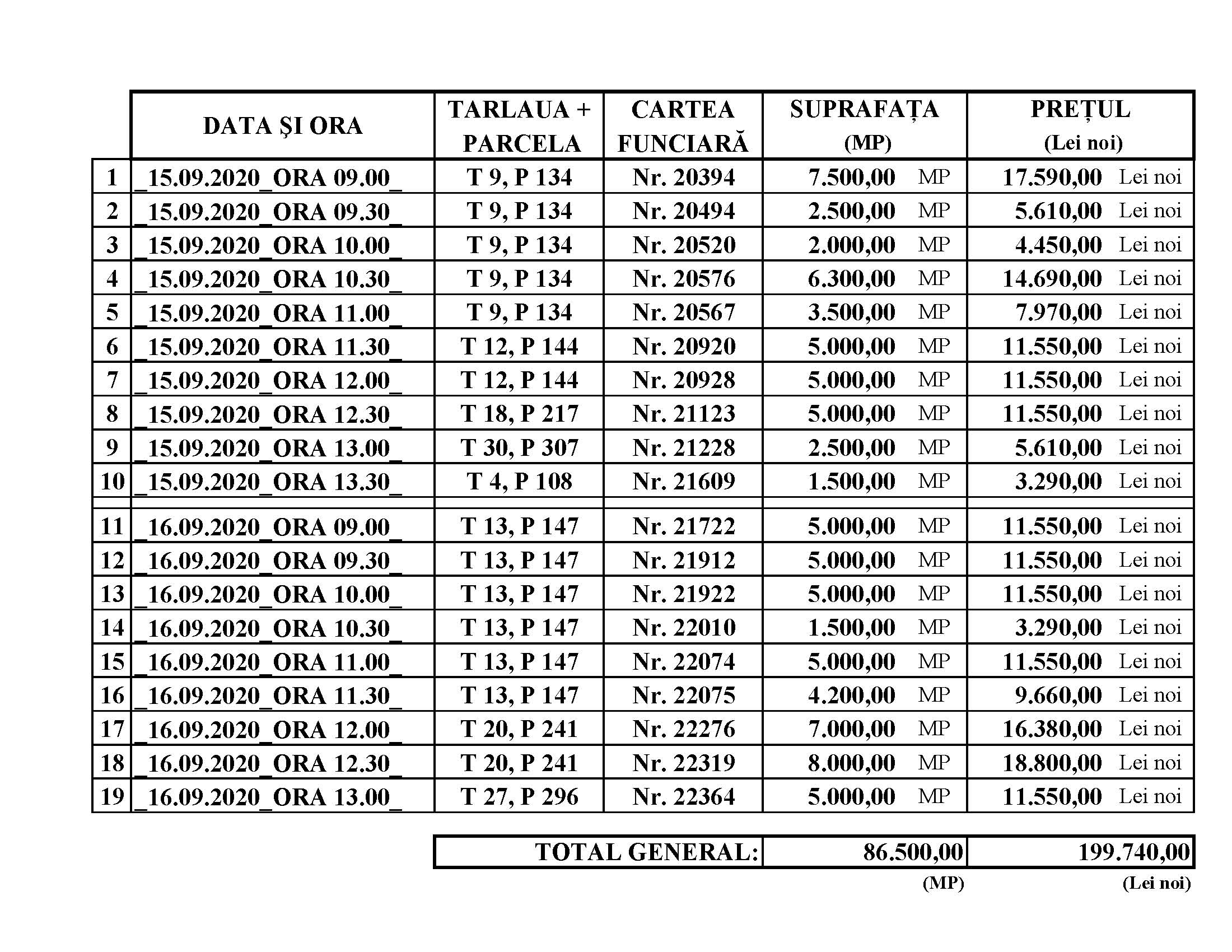 _Procedura de vanzare, pe 19 parcele, are loc in data de 15.Septembrie.2020 si in data de 16.Septembrie.2020. Intervalul orar incepe, in fiecare dintre cele doua zile, de la ora 09.00 si pana la ora 13.00, cu etapa de 30 de minute pentru fiecare parcela.