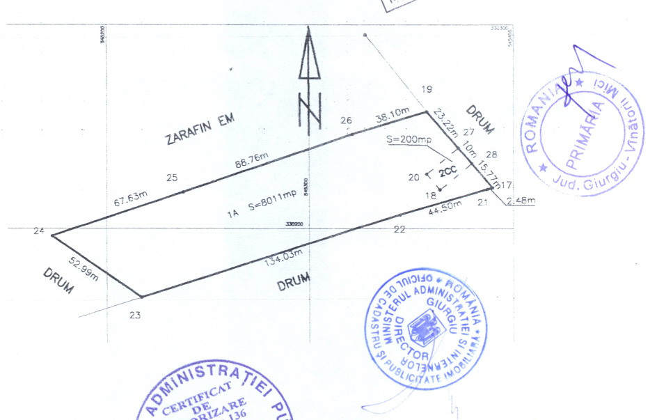 Vanzare teren 8211 mp cu 48 m la asfalt, Com Vanatorii Mici, Satul Valcele, judetul Giurgiu. Cadastru si CF, studiu geo, cu gard de lemn cu fundatie de caramida, porti metalice.