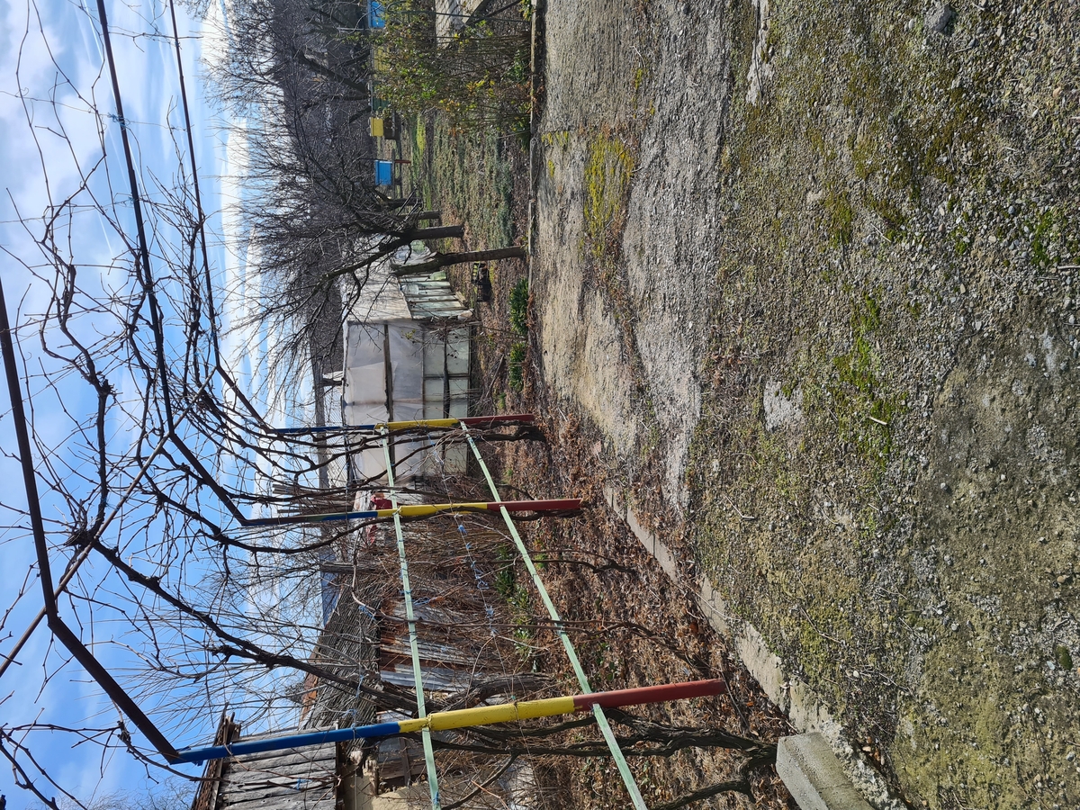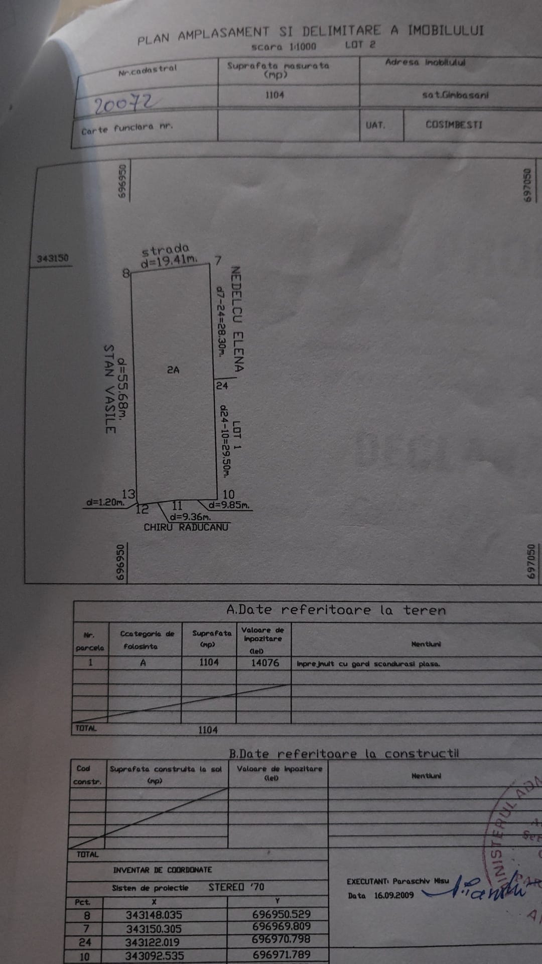 suprafata 1104 mp, strada Platanului, acces drum asfaltat. Terenul este racordat la apa curenta de la reteaua localitatii si la curent electric. Este imprejmuit complet si are 25 pomi fructiferi pe rod, vita de vie (inclusiv bolta construita din teava metalica), o baraca metalica (suprafata aprox. 20 mp) racordata la curent electric, cismea pentru apa, gratar din caramida, solar aprox. 20 mp, toaleta, alei din beton.