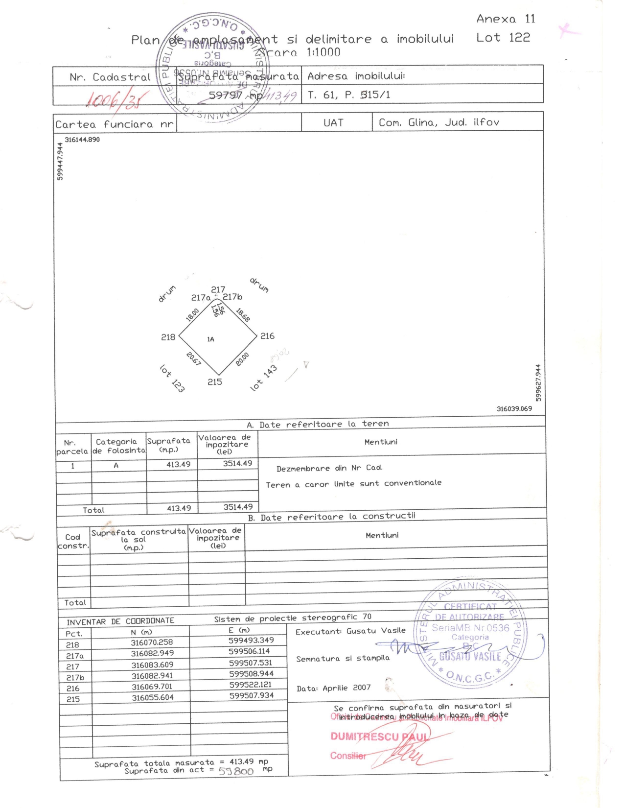 ocazie Glina -Cartier allegria, 413 mp, dubla deschidere, acte la zi, zona rezidentiala de case, utilitati (apa, canalizare, gaz, curent, cablu tv), cadastru si intabulare.