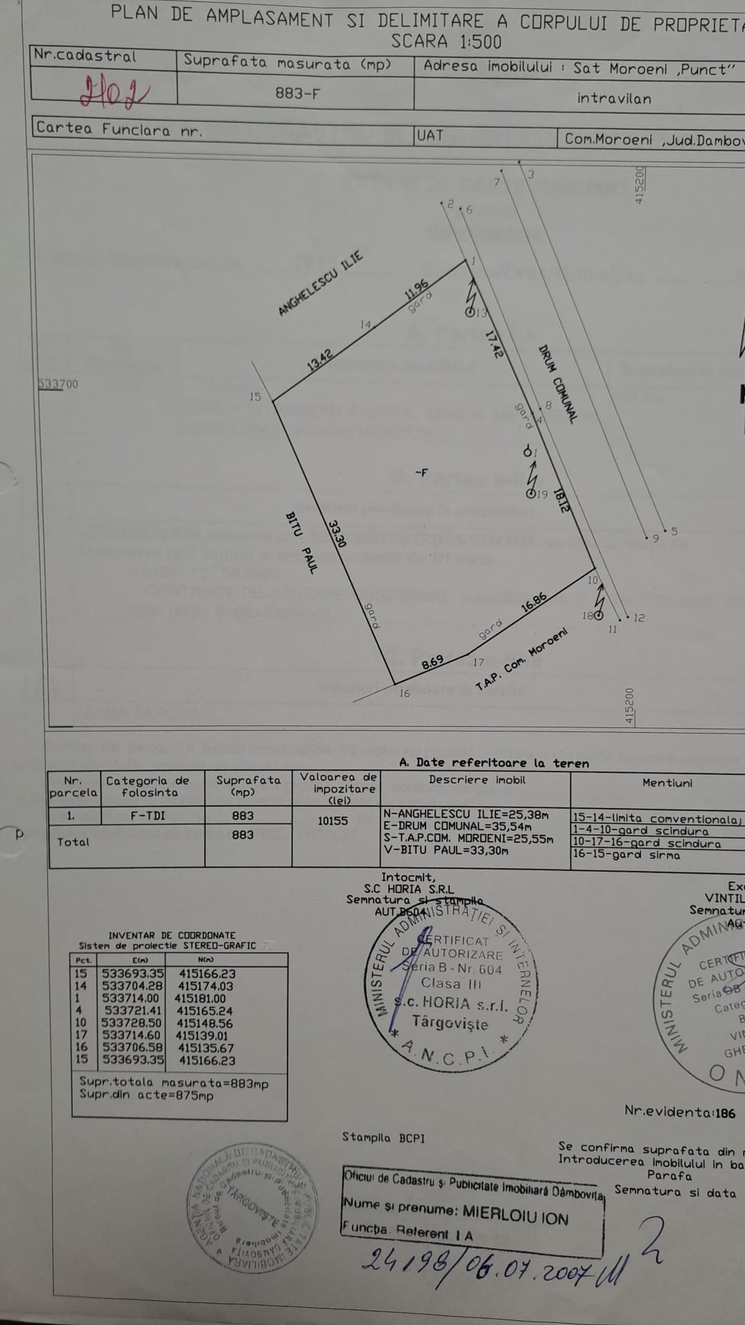 Teren intravilan, in Comuna Moroeni, judetul Dambovita, 883 mp. Deschiderea: 35,54 ml. Adancimea: 25,55 ml.