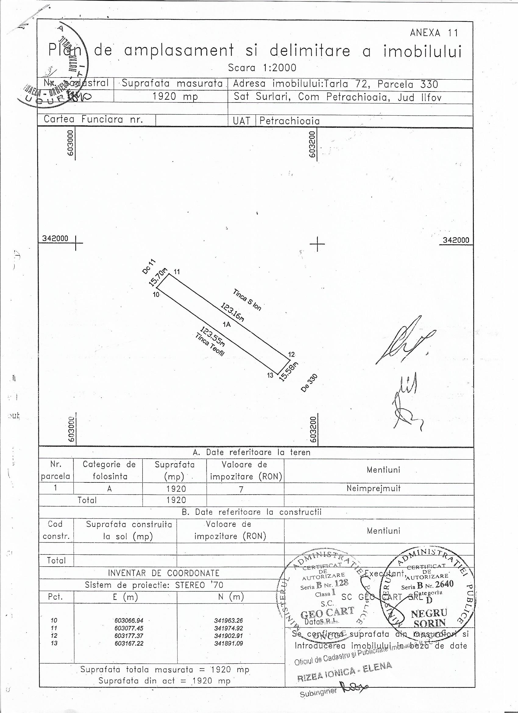Vand urgent teren intravilan in comuna Petrachioaia, pe DJ200A (la sosea), sup 1920 mp, (16/123), cadastru si Intabulare, accept intermediari, exista un proiect de vila aprobat si neexecutat.