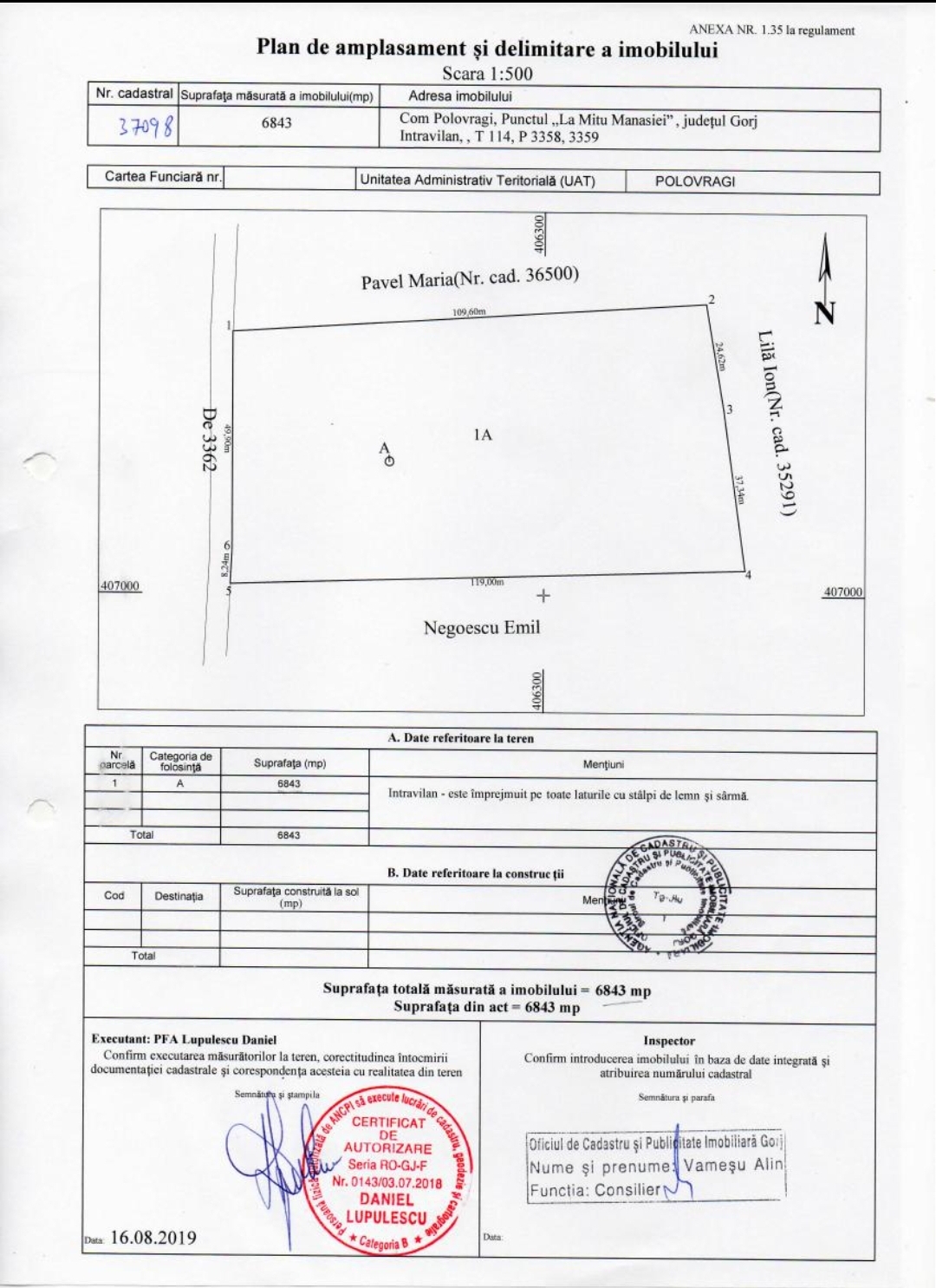Vand teren intravilan 6843 mp situat in Polovragi jud.Gorj la 500 m de centrul localitatii, pretabil constructie hotel, pensiune, complex turistic etc