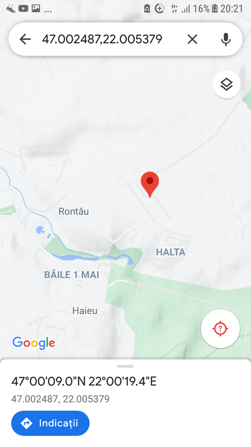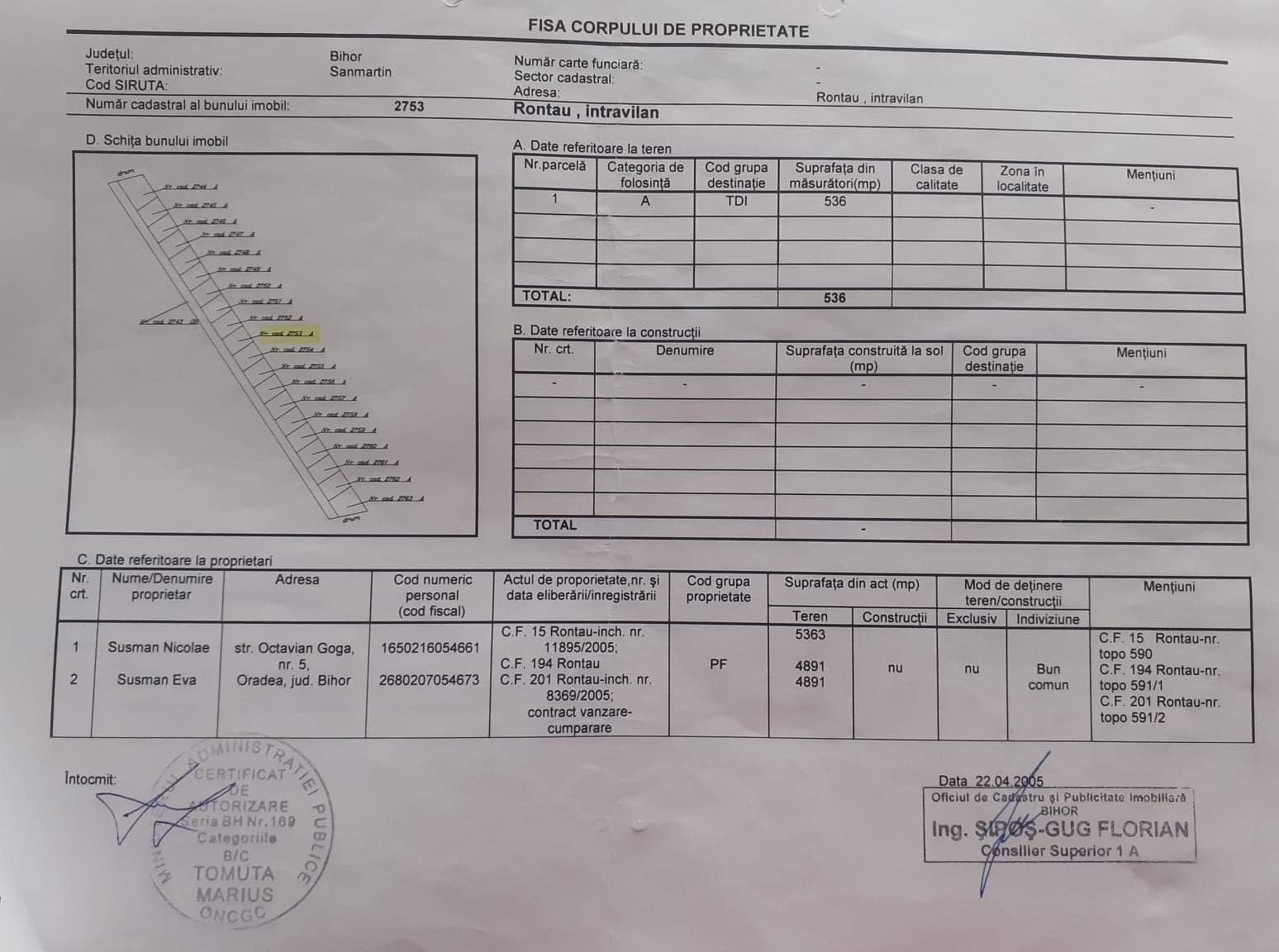 Vand parcela teren intravilan in Rontau, Baile 1 Mai, suprafata 536mp. Posibilitate de racordare la apa, canalizare si curent la 250 m,