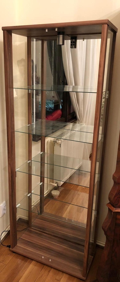 Vitrina moderna cu 4 rafturi, 2 usi de sticla si fondul din oglinda.