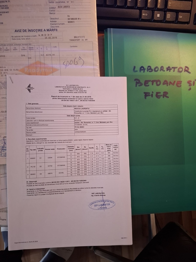 Detin documentatia completa a laboratorului tehnic pentru testarea materialelor (fier beton si beton), incluzand buletine de analiza si verificari de conformitate cu proiectul tehnic.