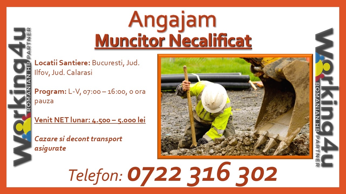 Pentru clientul nostru, companie aflata pe piata de peste 15 ani, specializata in lucrari si instalatii electrice, cu sediul in zona Sectorul 2, Bucuresti si santierele in zona Jud. Ilfov si Calarasi suntem in cautare de noi colegi cu experienta pentru postul de Muncitor Necalificat.