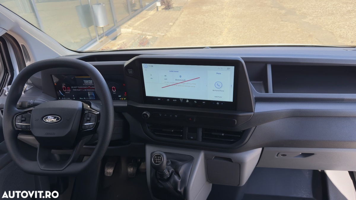2 chei tip briceag 2 manere de sustinere interior 4 difuzoare radio 8 inele ancorare marfa in compartimentul marfa Acoperire Partiala Podea Cauciuc Aer conditionat automat Alerta pentru directie gresita Anvelope cu dimensiune 215/65 R16C 109 T BSWT Aparatori noroi fata Aparatori noroi spate Asistenta inteligenta pentru viteza Asistenta pre-coliziune 2.0 Axa fata cu alunecare nelimitata Bancheta dubla pasager (trapa incarcare) Bara fata vopsita partial in culoarea caroseriei Bara spate vopsita partial in culoarea caroseriei Baterie Standard (Baterie Single H7 AGM) Blocare la distanta - intotdeauna oprit Camera digitala spate (doar camera video spate, nu contine ogllinda retrovizoare digitala (BSBA3)) Capace roti - complet Carcase oglinzi in culoare neagra Centura de siguranta neagra Coloana de directie fixa Configuratie blocare #1 Consola mica - pe podea Deschidere usi spate la 90º -180º Display de 13" Eliminare oglinda retrovizoare interioara Franare-TS/HLA/ESP/TC/ABS Geamuri electrice fata cu coborare la o singura atingere (doar pe partea sofer) Geamuri in tenta deschisa Goodyear Vendor- Standard Tread Inchidere Centralizata Interblocare Alcool Jante de otel 16" (Base: cu capac central, Trend ICE: cu capac complet , Lampa spate halogen Lumini ambientale (pe plafon) Lumini de zi Masa de tractare - sarcina medie Masa maxima autorizata - de baza Modem incorporat 5G Nu Contine Geam spate Nu contine degivrare luneta Oglinzi laterale – actionate electric si incalzite Pachet Parcare/ Camera retrovizoare spate (Asistenta pre-coliziune 2.0, Asistenta inteligenta pentru viteza, Pilot Automat, Pastrarea benzii de mers, Recunoasterea semnelor de viteza, Alerta pentru directie gresita, Senzori parcare spate, Senzori parcare fata, Camera digitala spate (doar camera video spate, nu contine ogllinda retrovizoare digitala (BSBA3))) Pachet radio 2 Pachet scaune 11A (Suport lombar - scaun sofer, Scaun sofer ajustabil manual pe 4 directii, Consola mica - pe podea, Bancheta dubla pasager (trapa incarcare)) Parbriz incalzit Pastrarea benzii de mers Perete despartitor metalic Pilot Automat Plafon standard jos Pornire fara cheie Prezoane roti Recunoasterea semnelor de viteza Rezervor combustibil ( 55L ICE) 63L PHEV SYNC IV Scaun sofer ajustabil manual pe 4 directii Schimbator de viteza turnat Senzori parcare fata Senzori parcare spate Sistem de incalzire - recirculare Sistem de monitorizare a presiunii in pneuri Sistem deblocare usi in 2 trepte Stergatoare – de parbriz cu senzor de ploaie Suport lombar - scaun sofer Tapiterie Plus Style 1, Black Onyx Trend BEV: cu capac complet Sparkle Silver) (Anvelope cu dimensiune 215/65 R16C 109 T BSWT, Goodyear Vendor- Standard Tread) Kit de reparare anvelope Torpedou cu posibilitate de incuiere Usa laterala culisanta Usi spate cu blocare Volan tip ''Base''