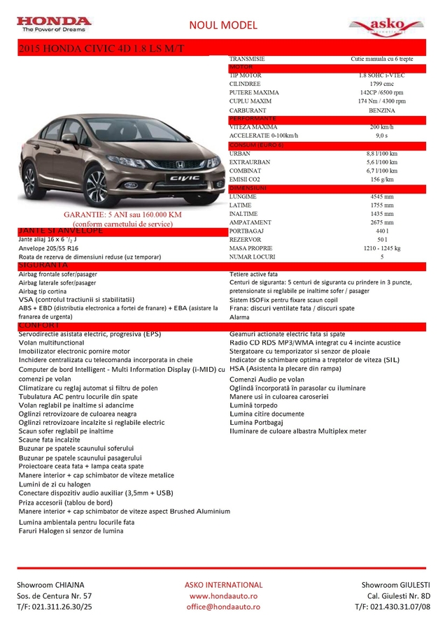 Vand Honda Civic 4d (sedan), primul proprietar, denumire comerciala 2015 Honda Civic 4D 1.8 LS M T.
