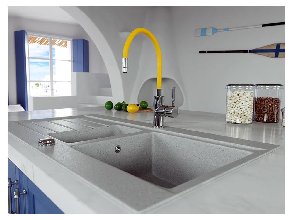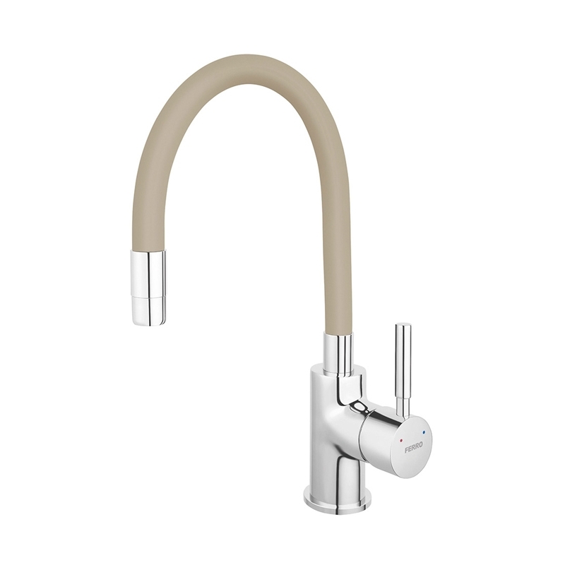 Baterie Ferro Zumba cu Pipa Flexibila Bej – necesita un singur orificiui pentru montare, are disc cartus ceramic si forma de gat de lebada pentru umplerea facila a recipientelor inalte. Raza extinsa de actiune se datoreaza capului de baterie rotativ la 360 grade. Materialul flexibil permite modelarea pipei atat pe inaltime, cat si pe lungime. Lungimea pipei este reglabila in intervalul 150-350 mm, iar inaltimea poate fi si ea adaptata in intervalul 280-440 mm. La livrare, pachetul contine furtunuri de legatura flexibile cu lungime de 400 mm si piulita de 3/8" pentru montare simpla si sigura si furtun cu invelis metalic.