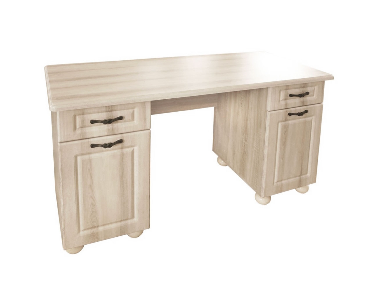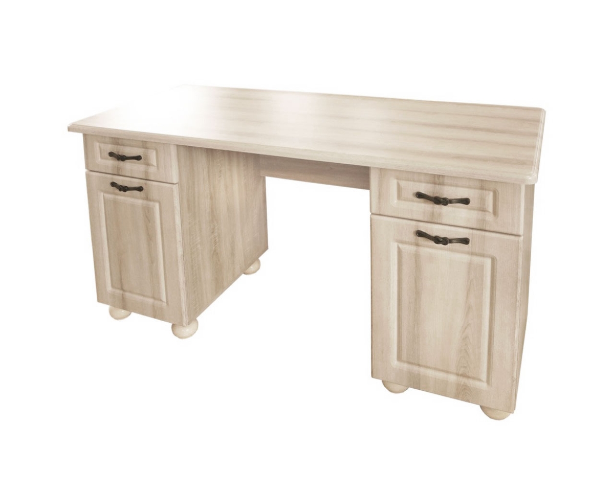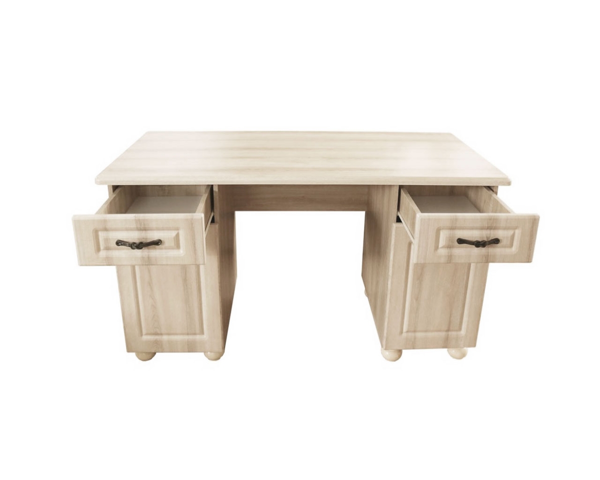 Picioarele clasice sunt fabricate din lemn si sunt vopsite, iar manerele metalice antichizate contribuie si ele la aspectul deosebit al biroului. Cele 2 sertare au glisiere cu bile si amortizare pentru o inchidere silentioasa, iar impreuna cu fundurile din PAL melaminat cu grosimea de 16 mm asigura o rezistenta sporita pentru folosirea zilnica a sertarelor. Lungimea biroului este de 1500 mm, inaltimea este de 795 mm, iar adancimea este de 650 mm.