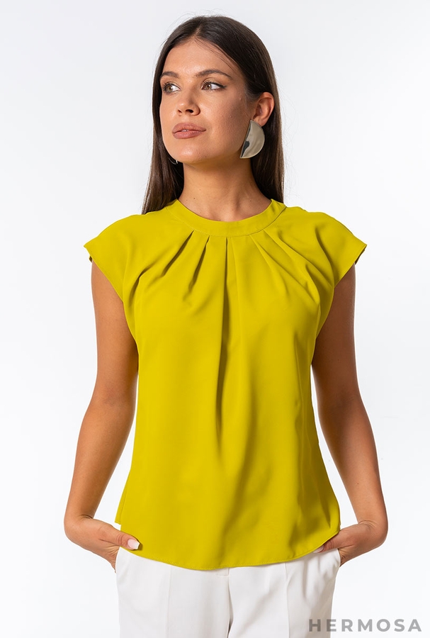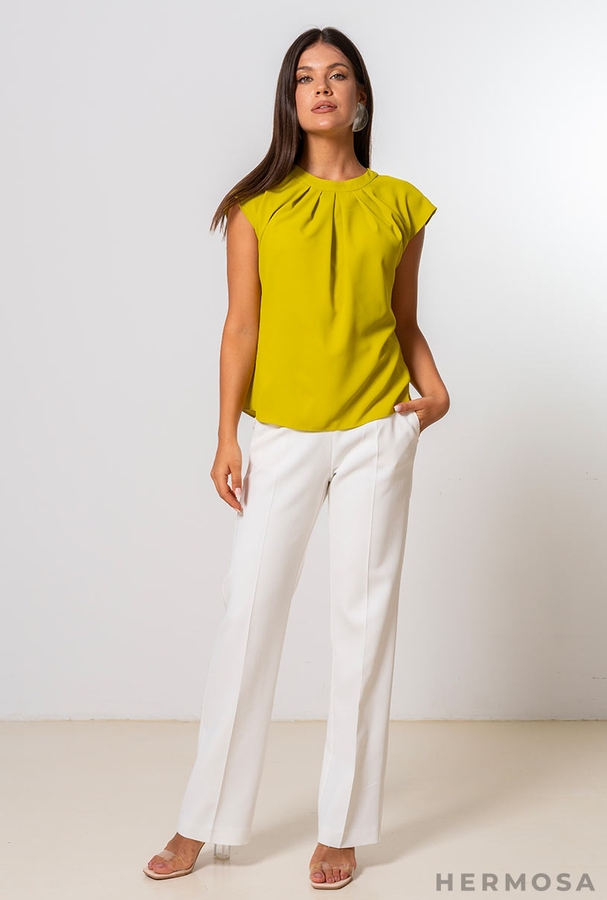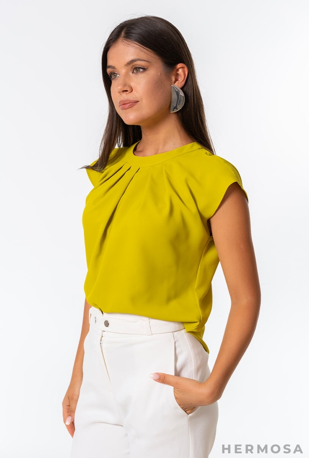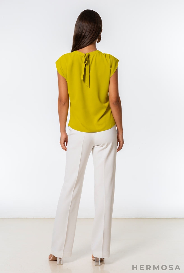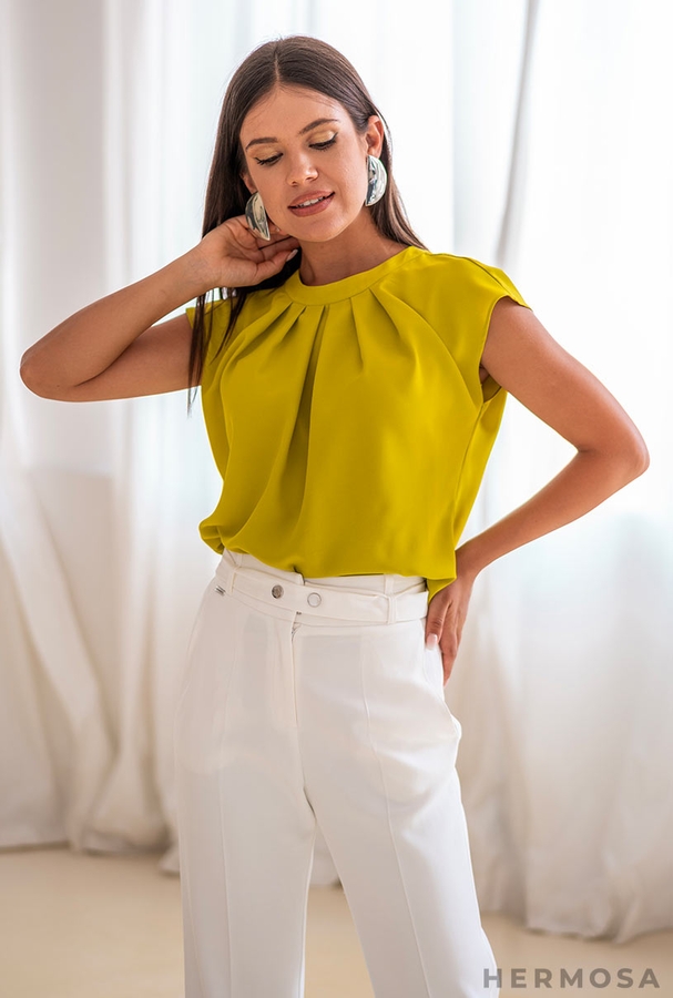 Stil si gratie: bluza casual din sifon. Designul cu maneci scurte usor cazute si guler rotund ofera un aer delicat si feminin. Pliurile decorative de pe partea frontala, creeaza un joc subtil de texturi, iar prinderea cu funda la spate adauga un detaliu romantic si sofisticat.
