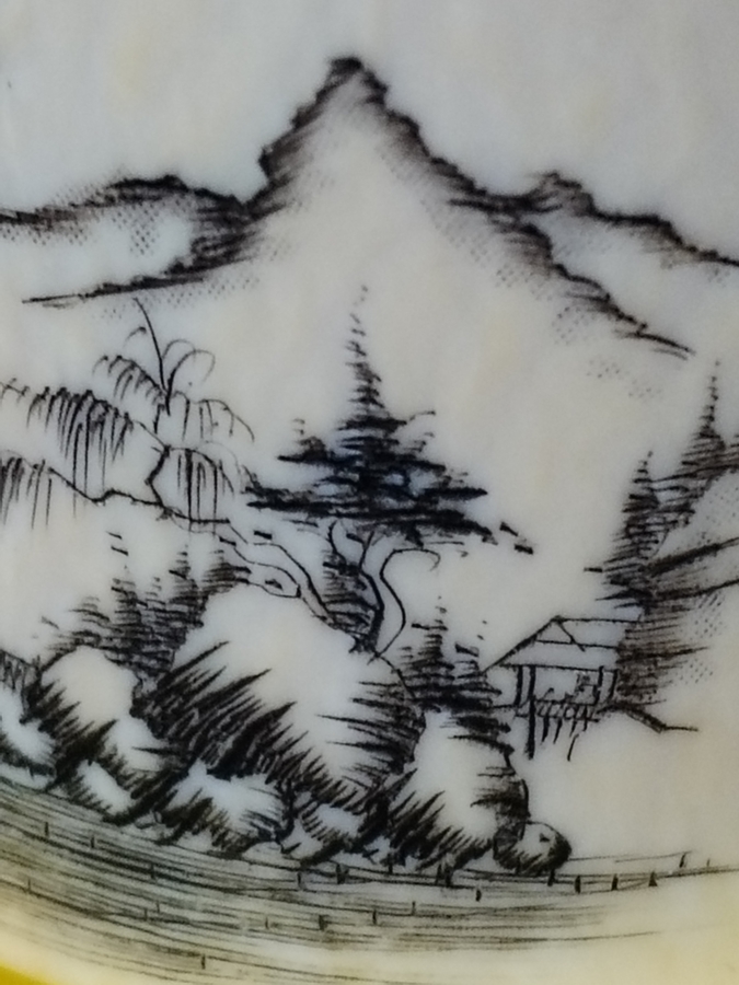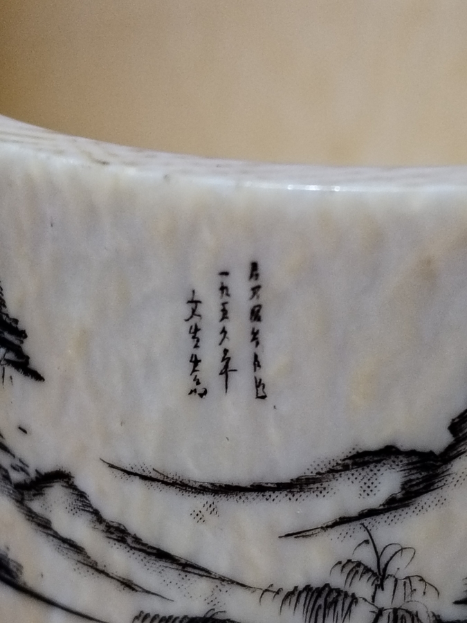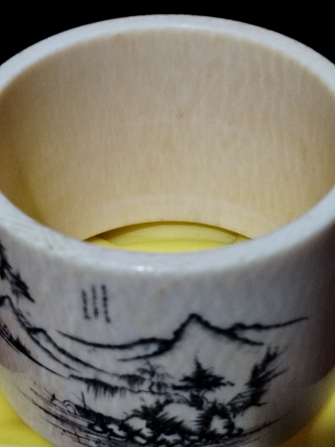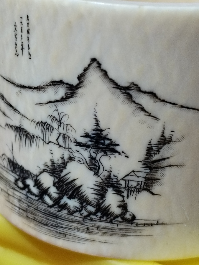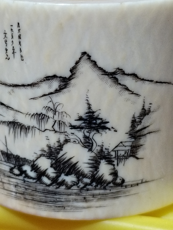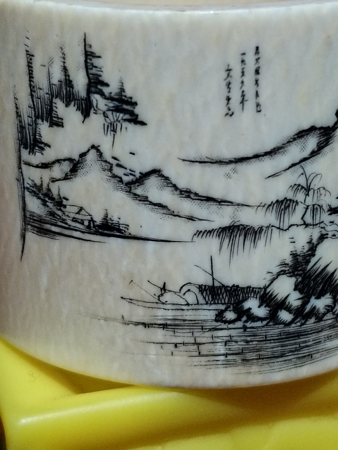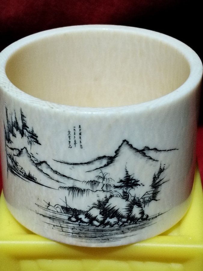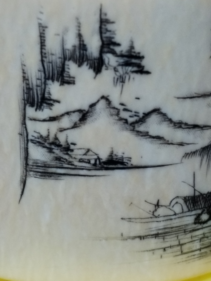Piesa de colectie unicat lucrata manual prin tehnica scrimshaw, reprezentand un peisaj traditional chinezesc, in stil pictura de tus.