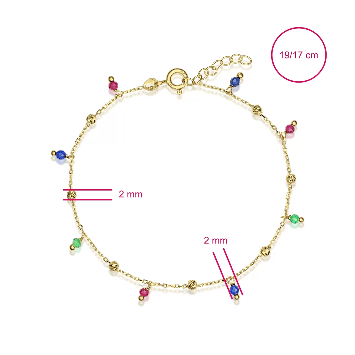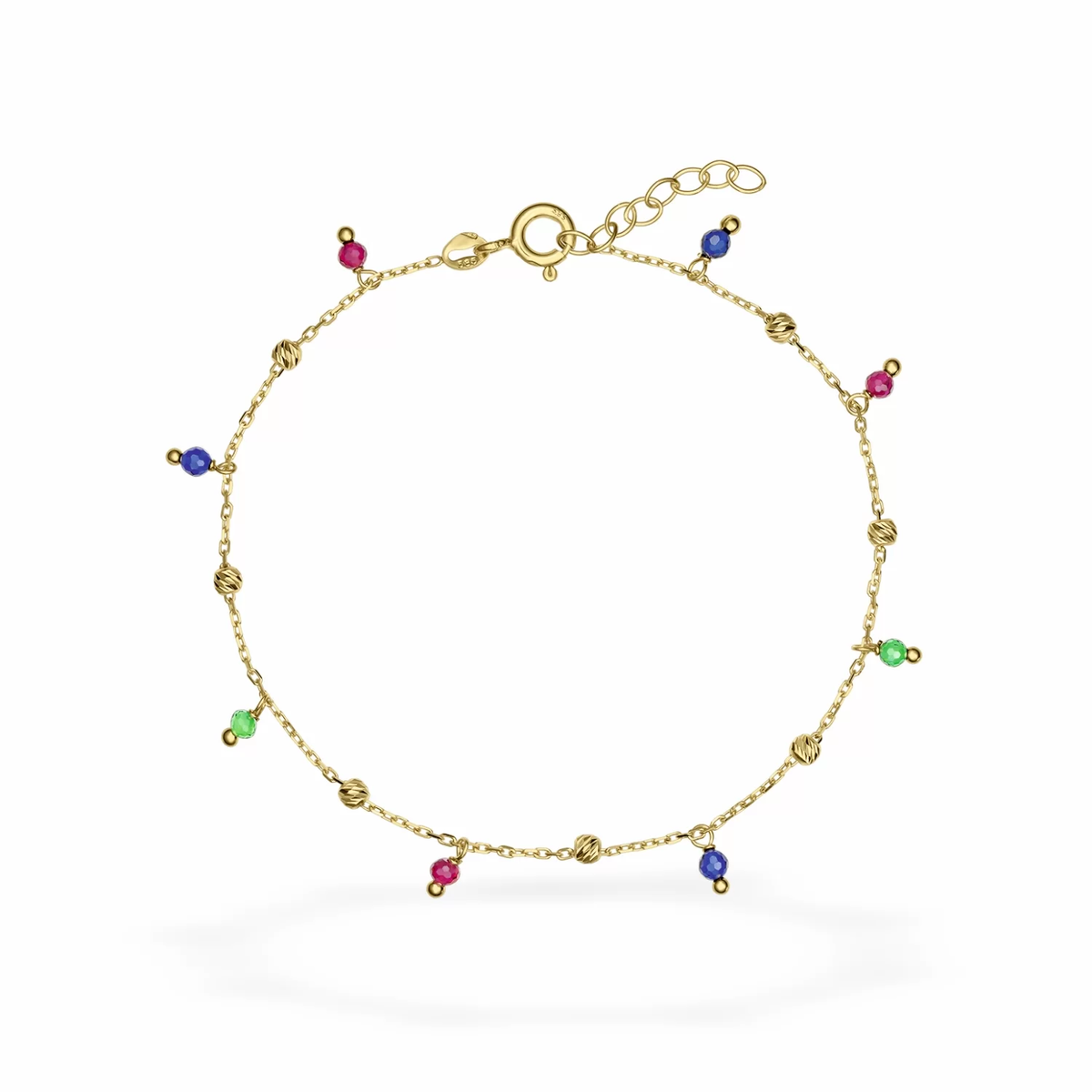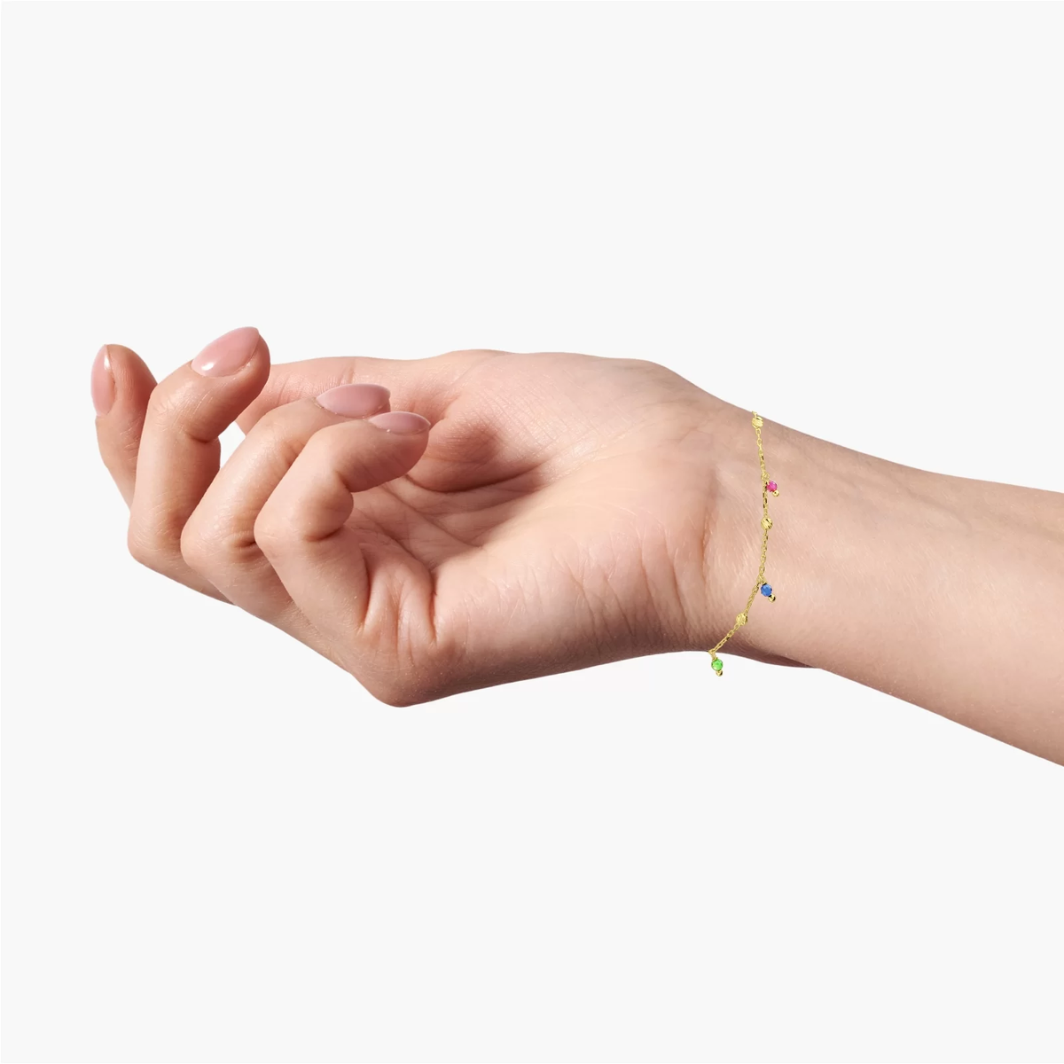 Aceasta bratara fina din aur, decorata cu pietre cubic zirconia multicolore, surprinde veselia si stralucirea tineretii. Cu o lungime reglabila (17-19 cm), este un accesoriu versatil, menit sa fie purtat si pretuit ani la rand.