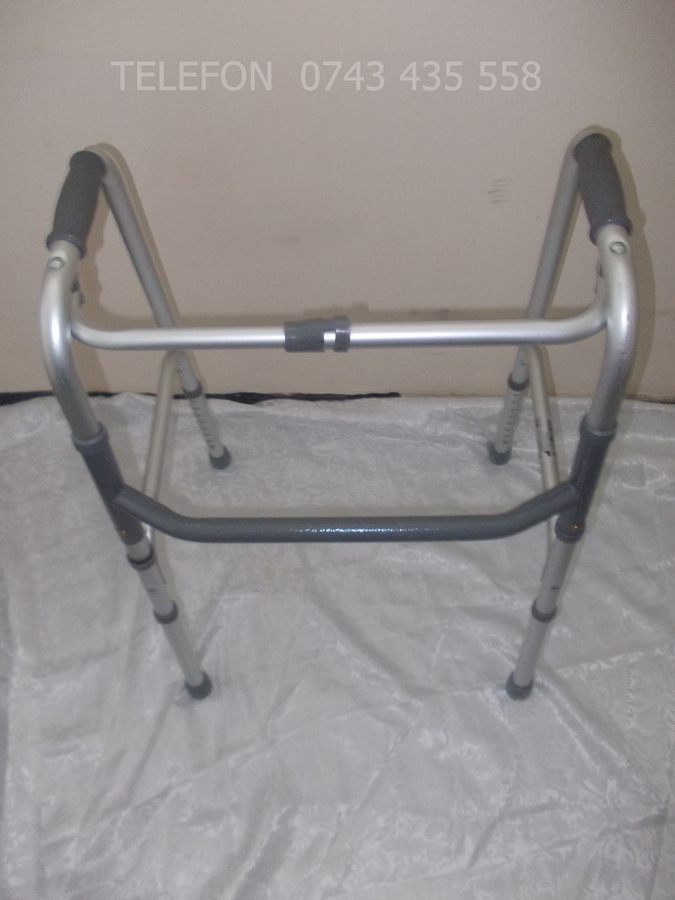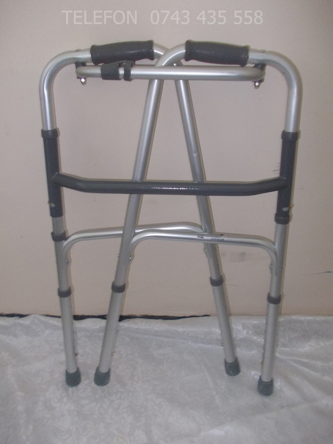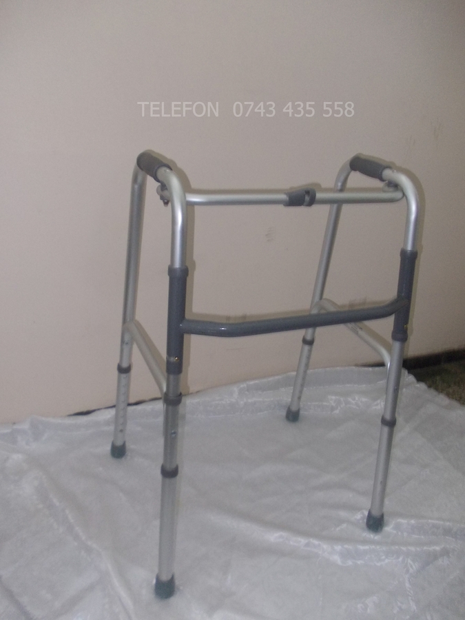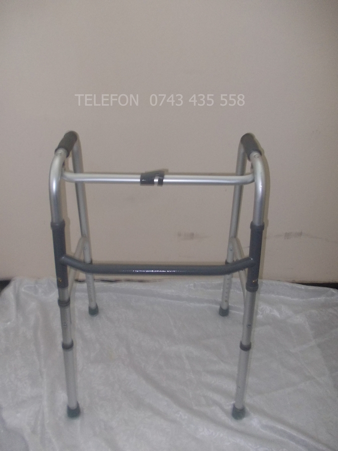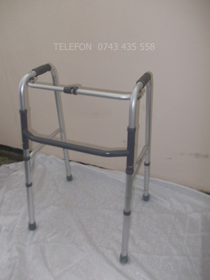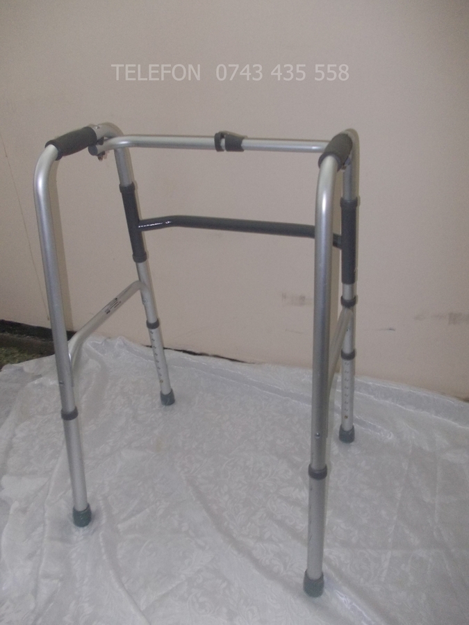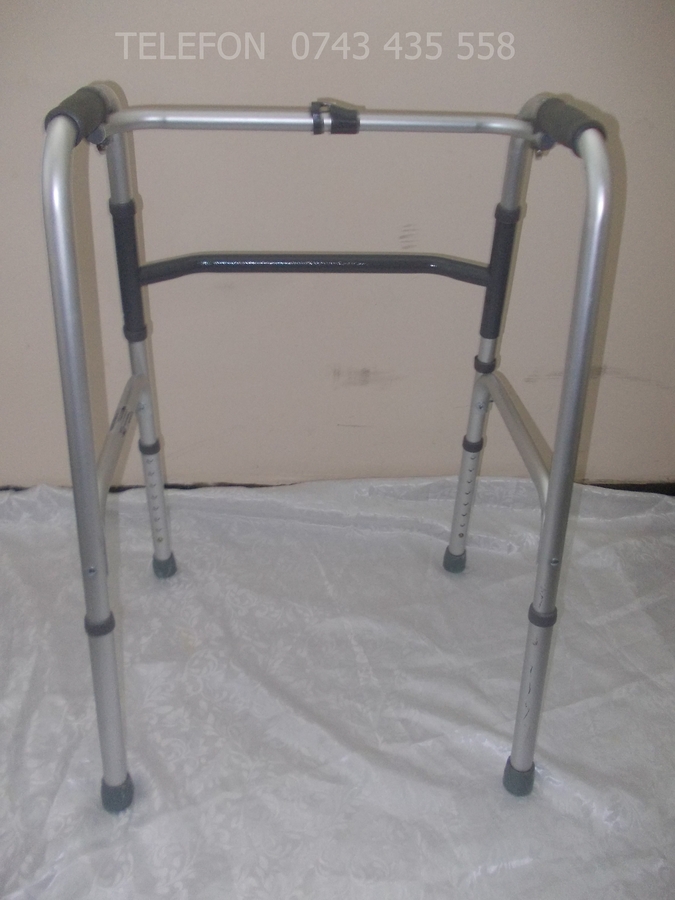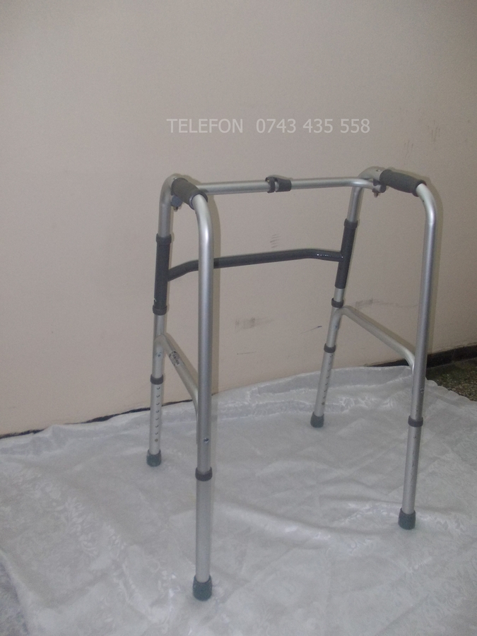 Vindem la Bucuresti, nu expediem in alte localitati, la pret fix 79 Lei vindem cu proba cadrul pliabil din cele 8 poze realizate de noi, foarte rezistent si usor deoarece e fabricat din aluminiu pentru ajutor la mers la interior in casa garsoniera studio apartament vila dormitor sufragerie living camera hol baie bucatarie balcon terasa penthouse sau in exterior afara la plimbare miscare relaxare in parc pe alei in oras pe trotuar sau in spital policlinica dispensar, azil pentru varstnici, camin, internat, cadru cu dublu sprijin, cadru telescopic, ce se poate regla pe inaltime sa fie mai inalt sau mai putin inalt, plimbator mergator pasitor, usor si foarte rezistent, in stare excelenta ca nou si perfect functional, pentru persoane cu dizabilitati locomotorii dezabilitati, handicap locomotor, persoana bolnava la recuperare medicala dupa operatie, posttraumatic avc atac vascular cerebral, accident rutier accidentarile care apar pe fondul practicarii sporturilor; accidentele auto sau de motocicleta.si din alte cauze, persoane si cu diverse boli, probleme medicale de sanatate, ortopedie, afectiuni ortopedice, ale sistemului musculo-scheletal oase, articulatii, muschi, ligamente, tendoane, fracturi, artroze, ale ligamentelor sau muschilor, durerile cronice articulare sau osoase, uzura si degenerarea produse de varsta, boala, scleroza multipla; cancer; afectiuni ale nervilor, pentru seniori,i, batran, in etate, in varsta, bunici, persoane ce se pot deplasa mai greu si au nevoie de un sprijin.