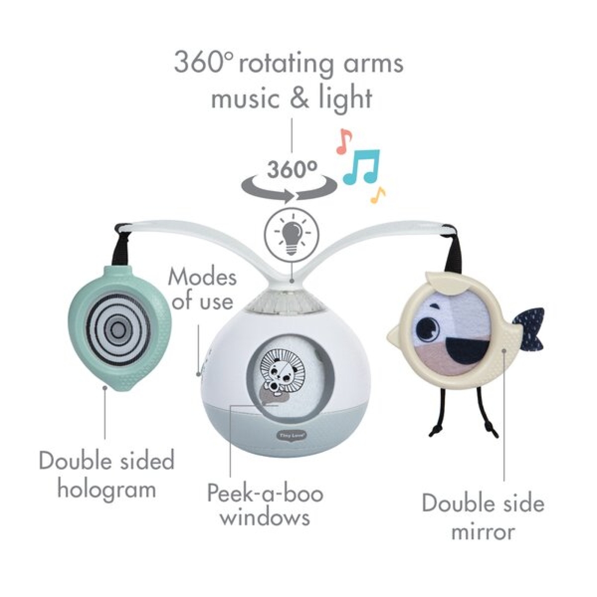 Jucariile cu oglinda cu doua fete si holograma atrag atentia bebelusului.