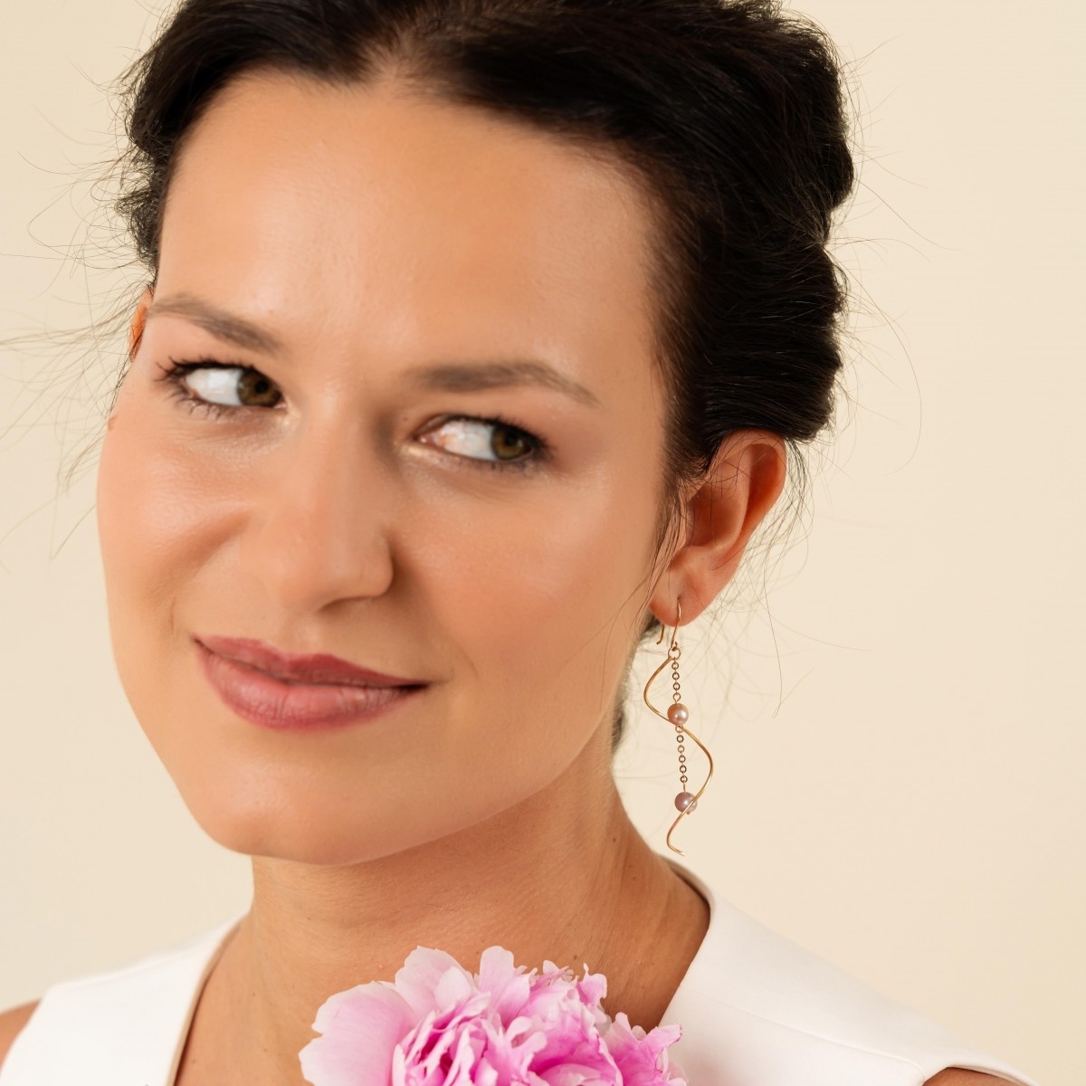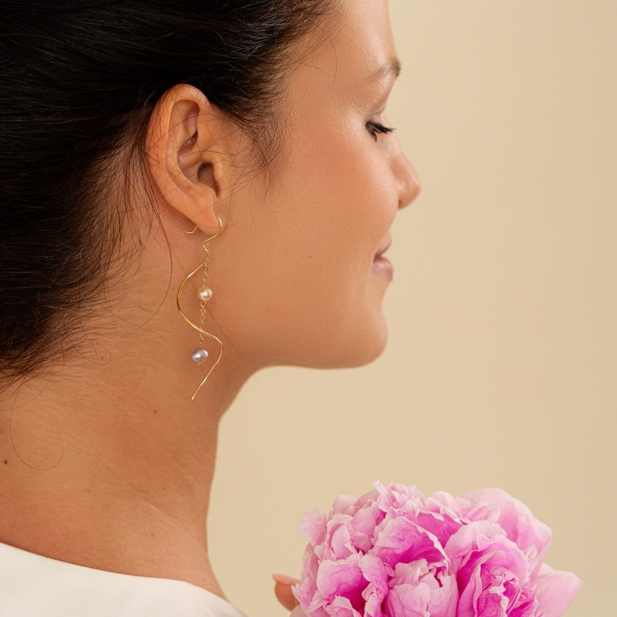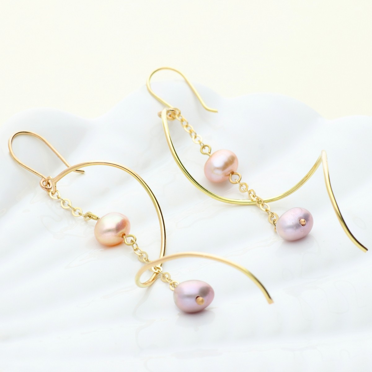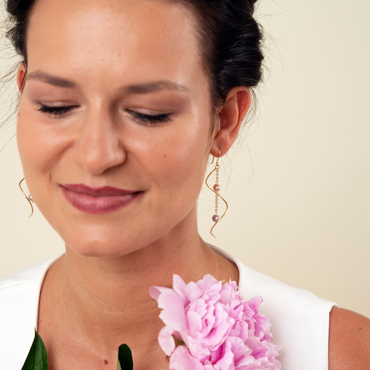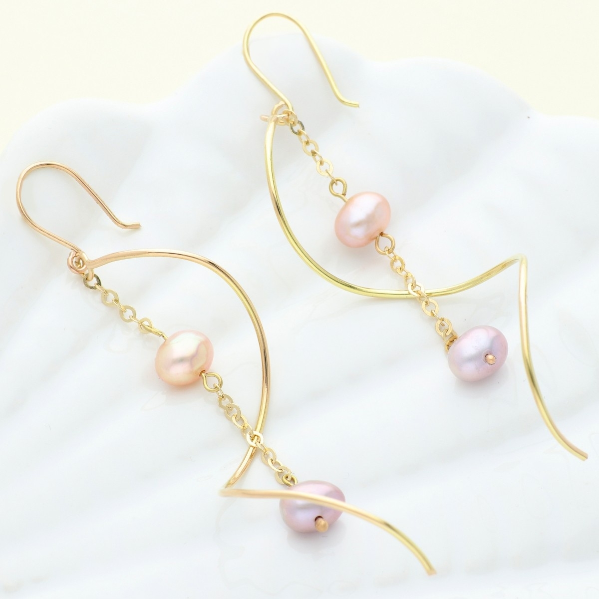 Cercei atarnatori bara spirala perlute de cultura, aur galben 14K