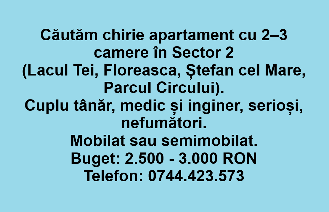 (Lacul Tei, Floreasca, Stefan cel Mare, Parcul Circului). Cuplu tanar, medic si inginer, seriosi, nefumatori. Mobilat sau semimobilat.
