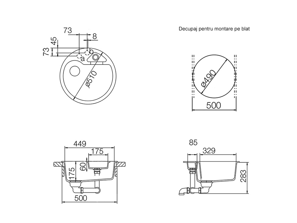 Cristalite Croma 510 x 510 mm cu sifon automat, compozit granit, montare pe blat, gri