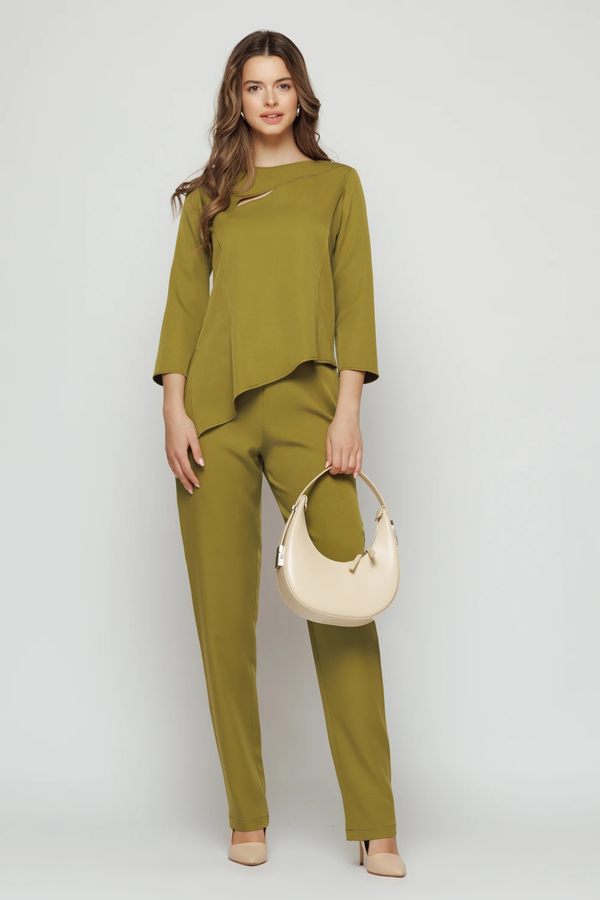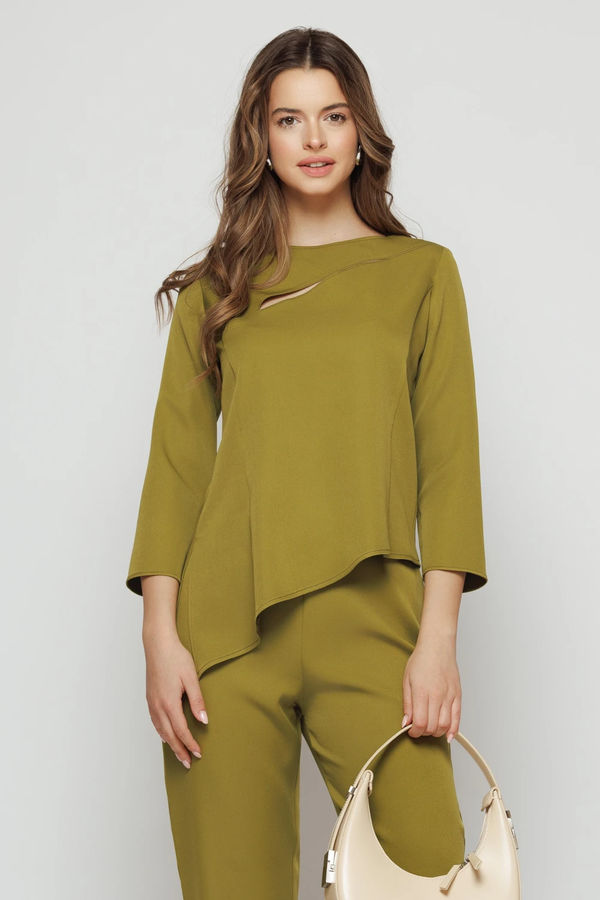 ✔ Bluza asimetrica cu decolteu rotund la baza gatului si decupaj fin, maneci trei sferturi si crepeu lateral, pe partea dreapta