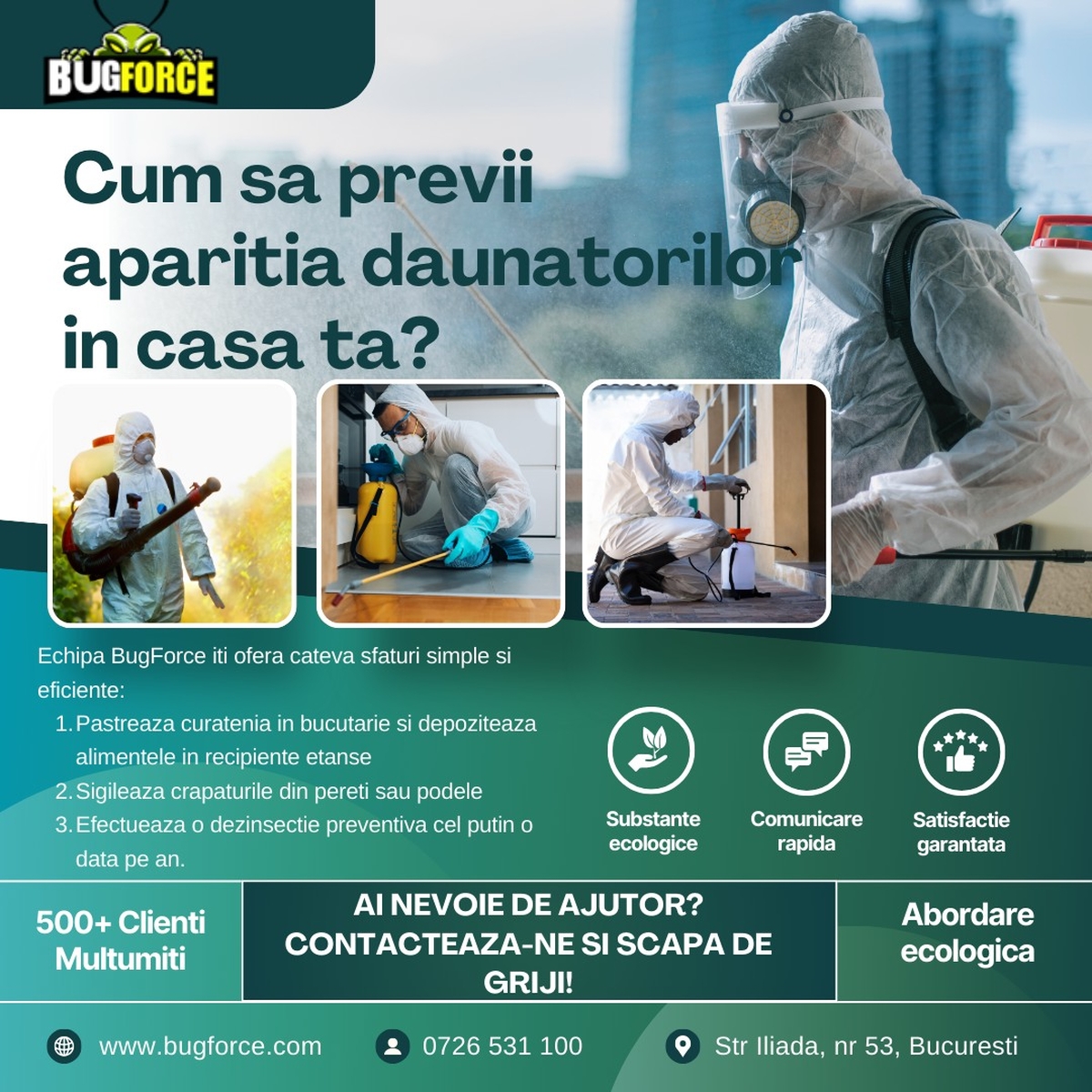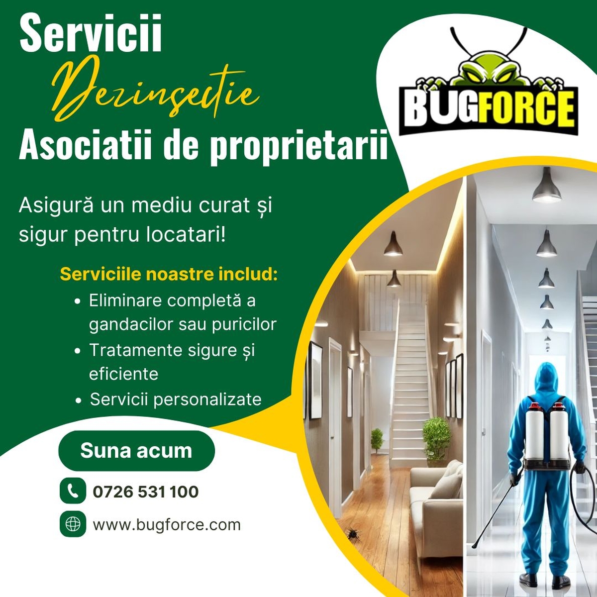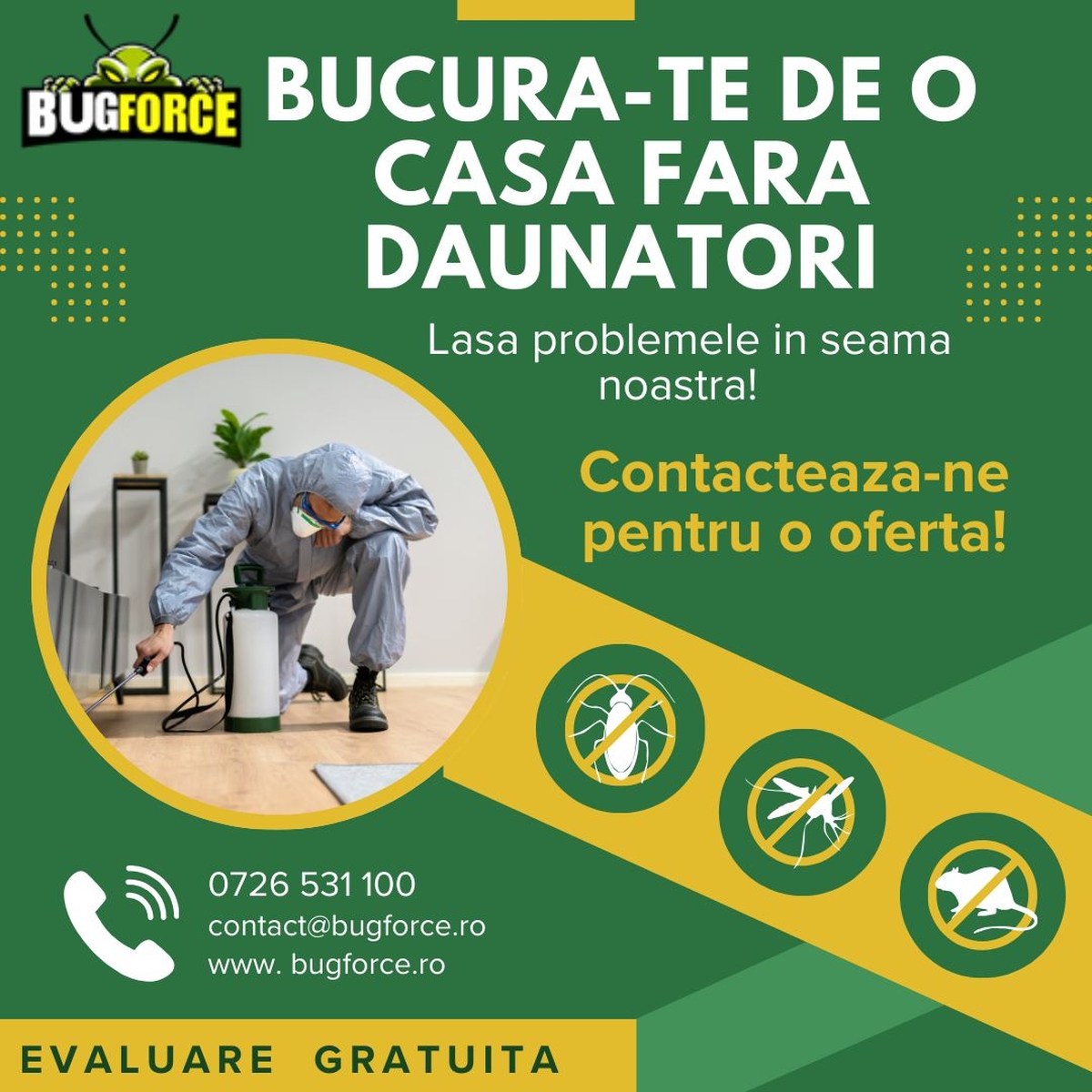 La BugForce, ne dedicam eliminarii daunatorilor si protejarii confortului tau!  Cu servicii rapide, eficiente si sigure, te ajutam sa scapi de plosnite, gandaci, furnici, soareci si alte probleme care iti afecteaza linistea.
