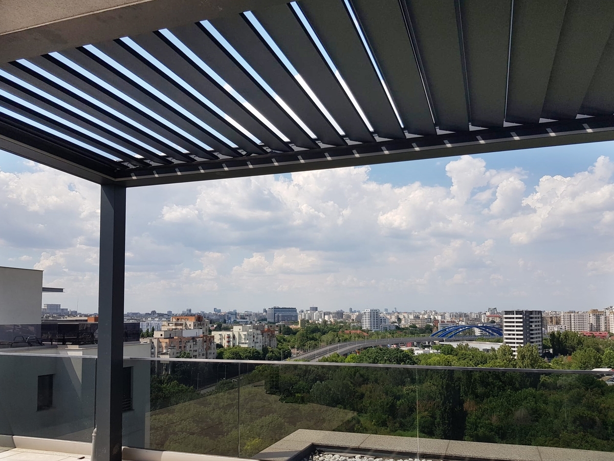 Designul pergolei este minimalist si modern, potrivit pentru case rezidentiale, restaurante, rooftop-uri sau spatii de evenimente. Structura este autoportanta sau se poate ancora de o fatada, fiind disponibila in culori personalizate (gama RAL).