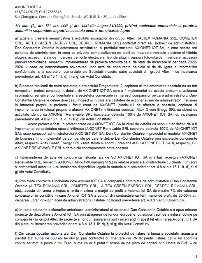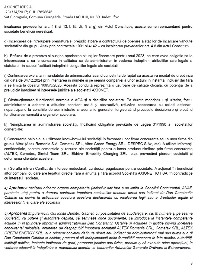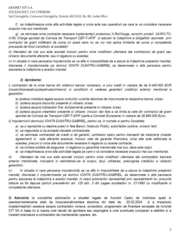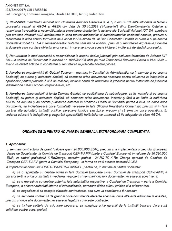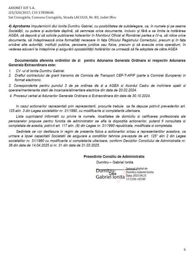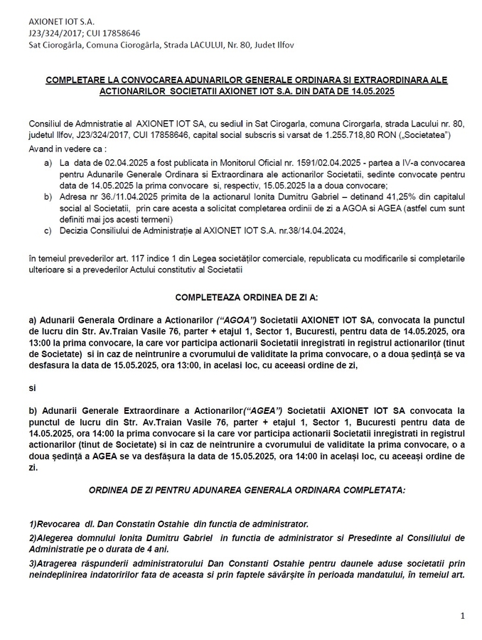Completare la Convocarea Adunarilor Generale Ordinara si Extraordinara ale Actionarilor Societatii Axionet IOT S.A. din data de 14.05.2025